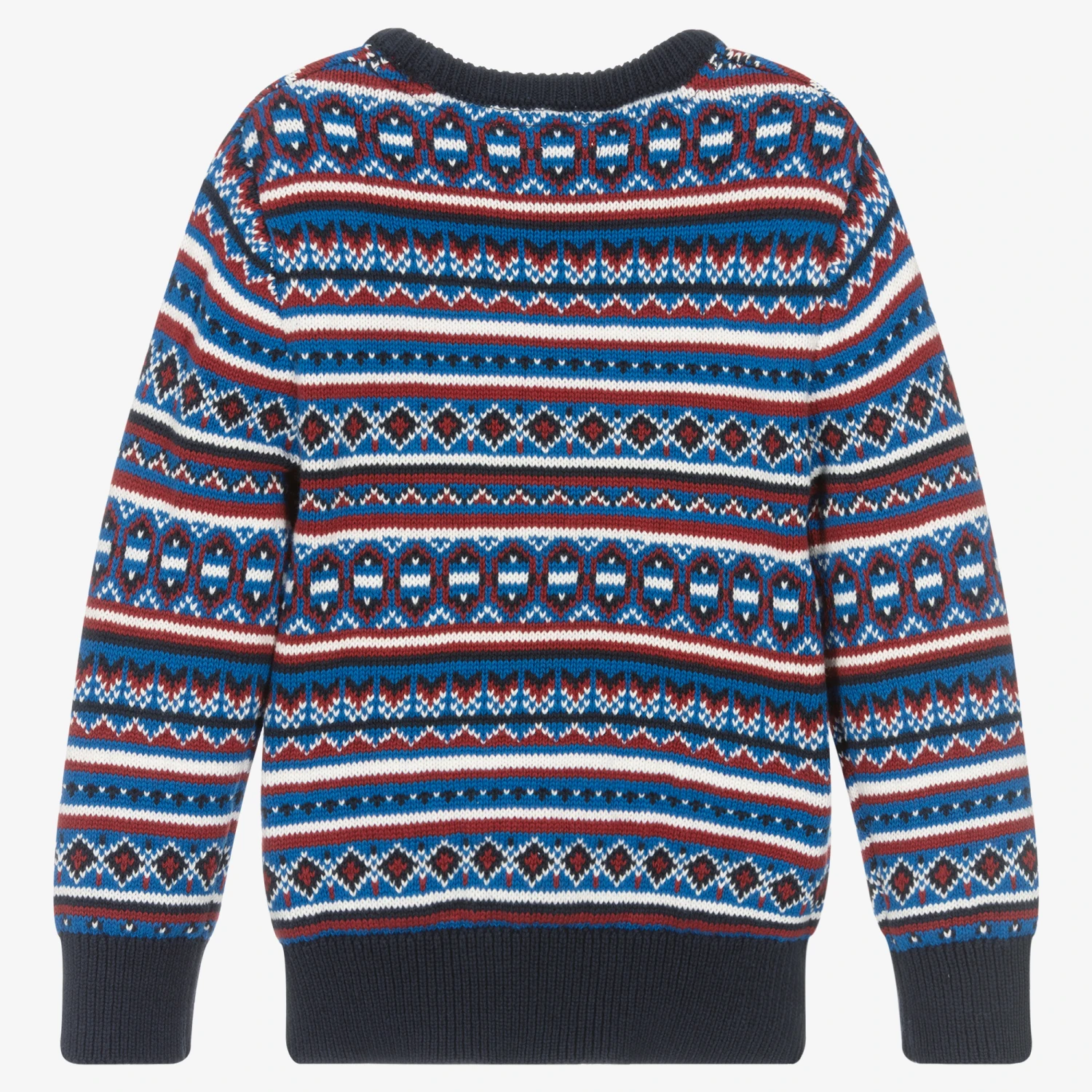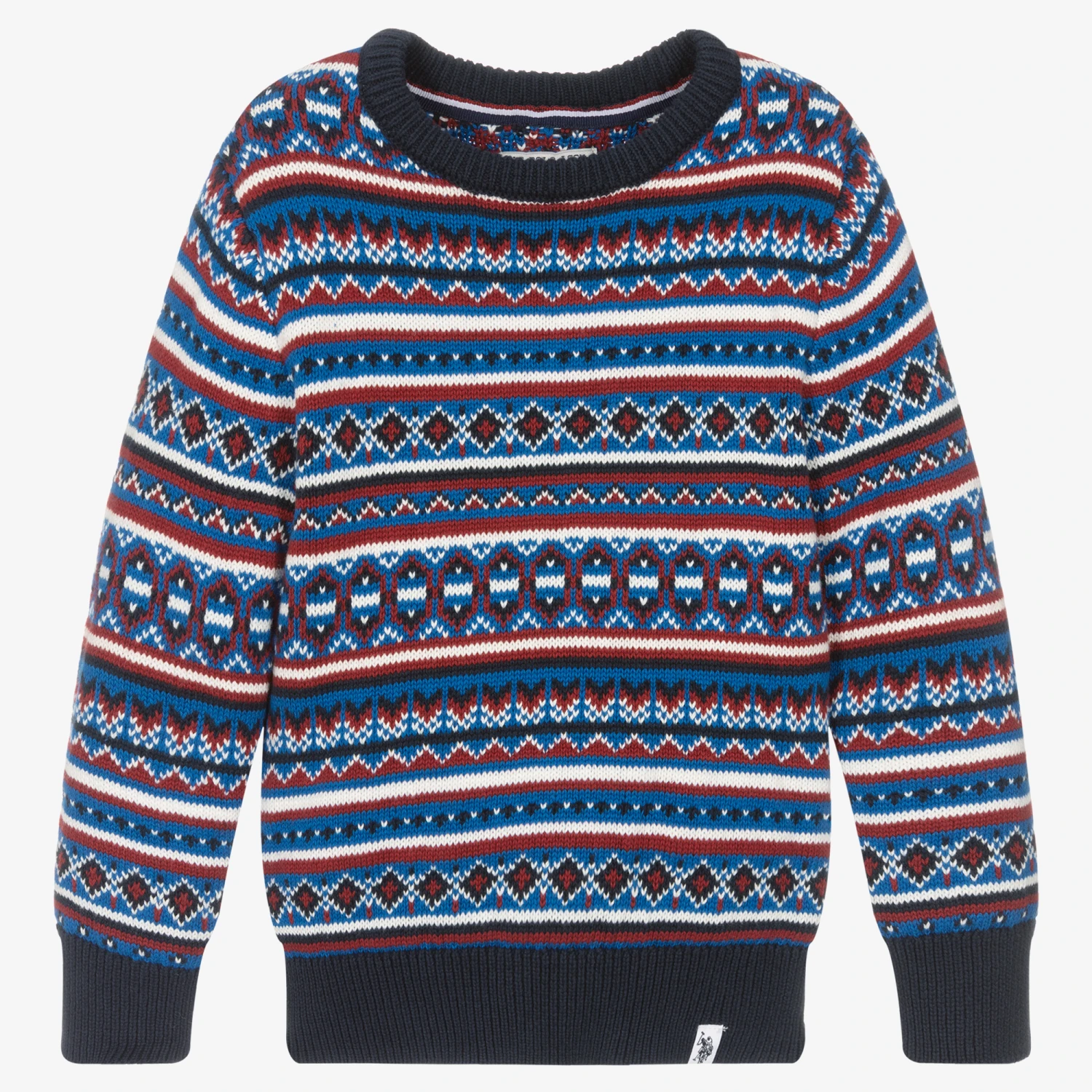 Blue and burgundy red sweater for boys by U.S. Polo Assn., in a soft and cosy cotton knit. In a timeless fair isle pattern, this lovely layer has a navy blue, ribbed neckline and the brand’s double horseman logo sewn on the hem.
