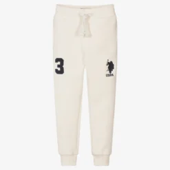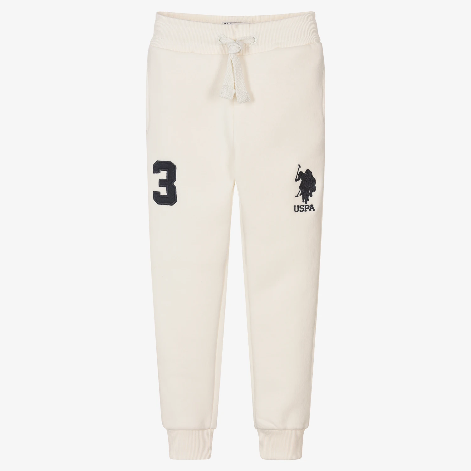 Ivory joggers for boys by U.S. Polo Assn., made from super soft cotton jersey. Sporty and casual, they have an embroidered double horseman logo, with a number ‘3’ patch in navy blue. The drawstring waist and side seam pockets ensure comfortable wear. There is a single pouch pocket on the back, with a striped tag attached.