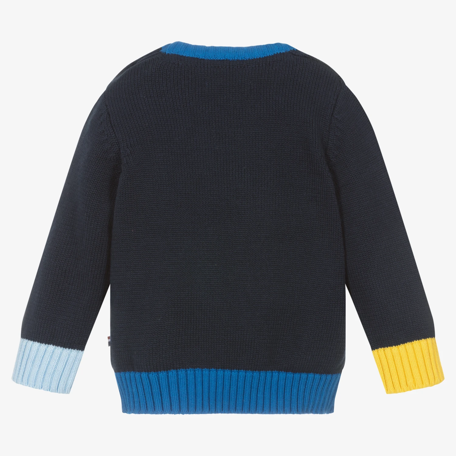 Navy blue sweater for younger boys by U.S. Polo Assn., made in a soft and cosy cotton knit. Lovely for layering, it has a multicoloured double horseman logo embroidered on the front and complementing blue and yellow trims. On the smaller sizes, there are popper fastenings on one shoulder for easy dressing.