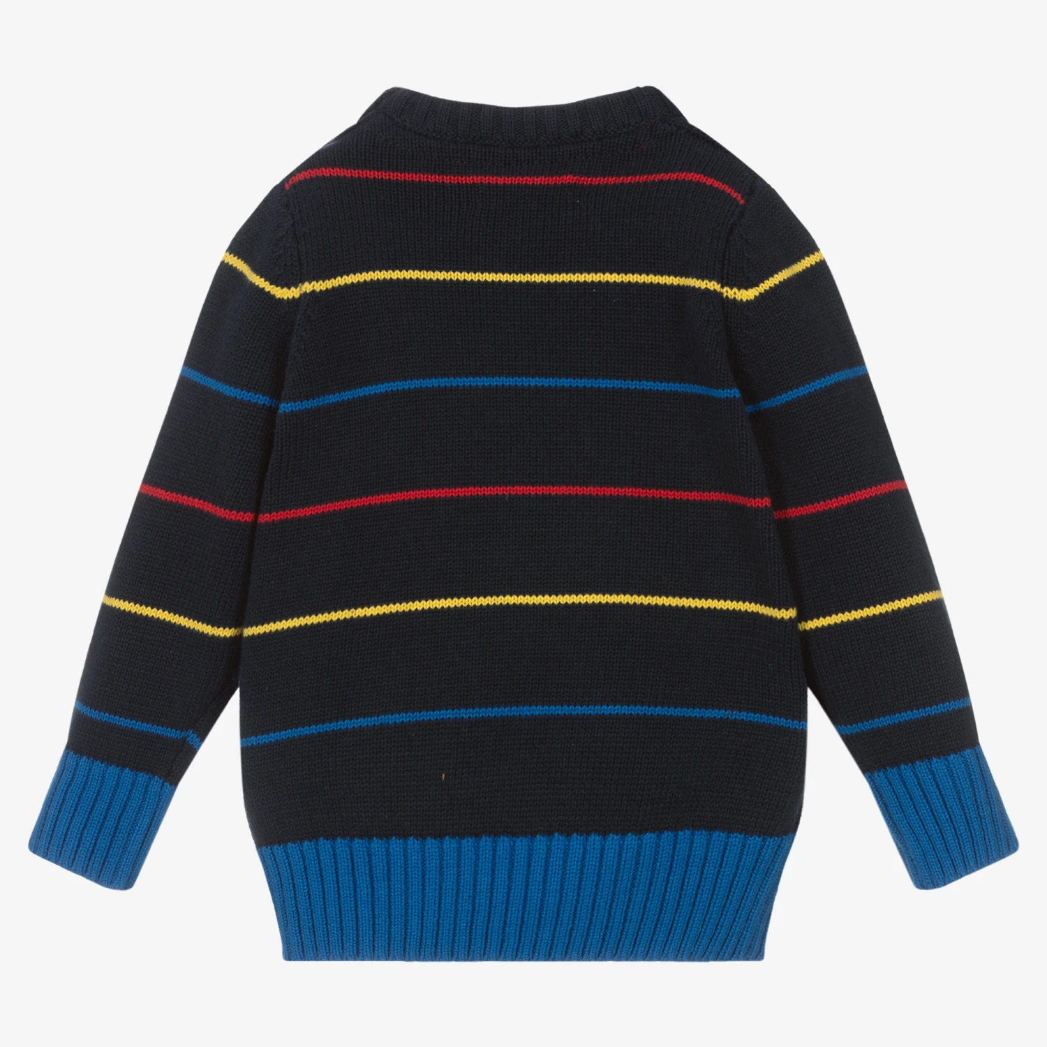 Navy blue sweater for younger boys by U.S. Polo Assn., in a soft and cosy cotton knit. Great for colder weather, this striped layer has a ribbed neckline and bright blue cuffs and hem. There are easy popper fastenings on one shoulder and the brand’s double horseman logo embroidered on the chest.