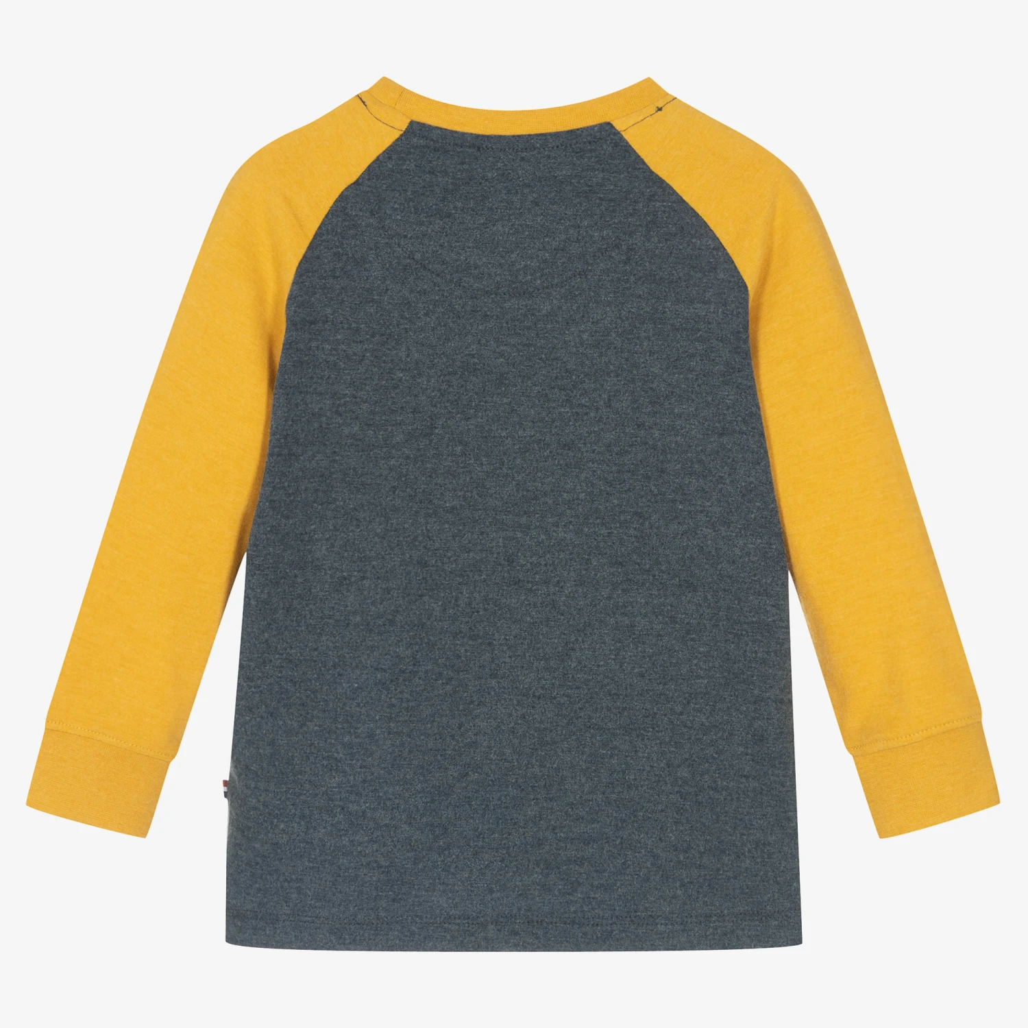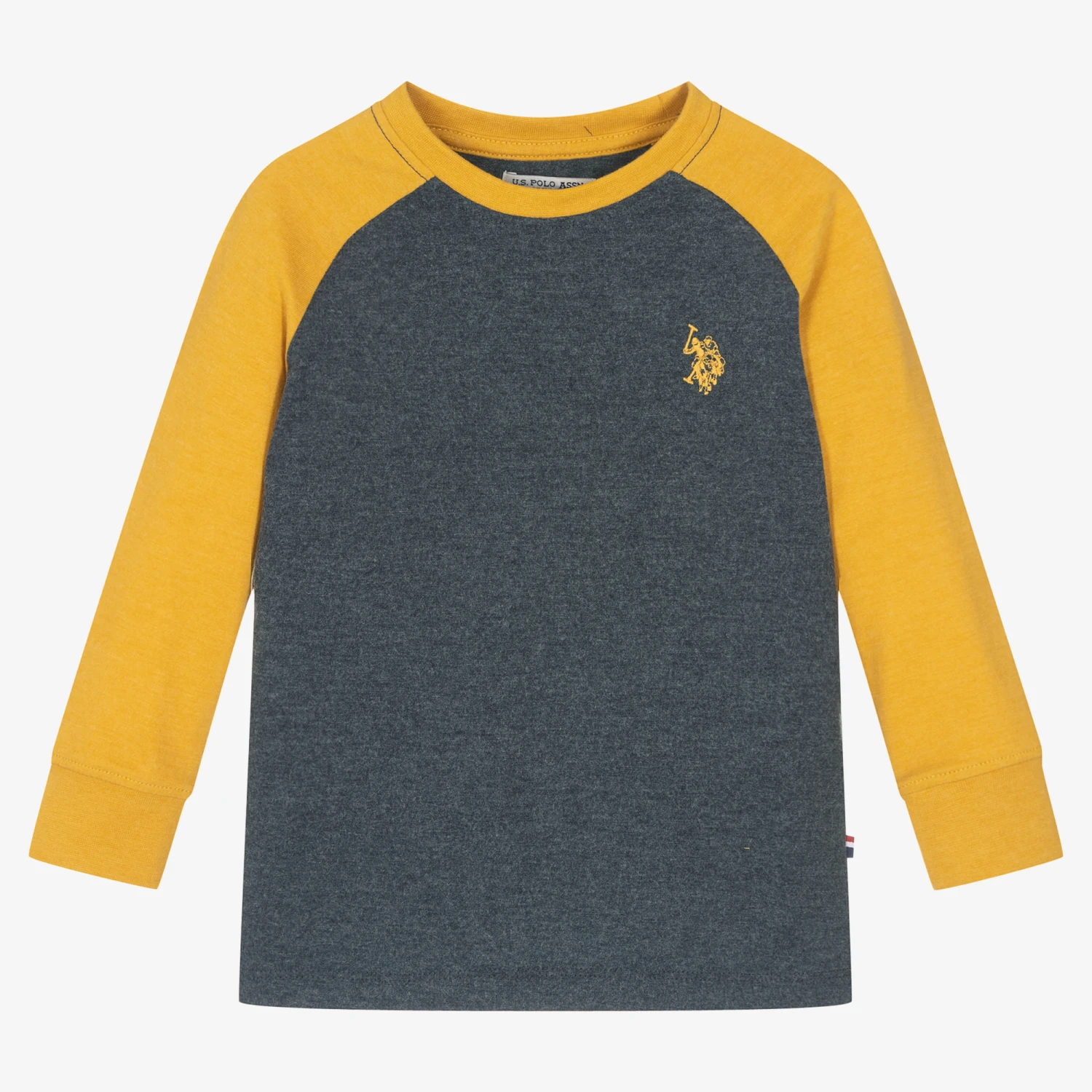 Navy blue marl top for boys by U.S. Polo Assn., made in a soft cotton jersey blend. A great option for casual wear, it has mustard yellow raglan sleeves, a comfortable crew neck and lightly ribbed cuffs. The brand’s double horseman logo is embroidered on the chest for a distinct finish.