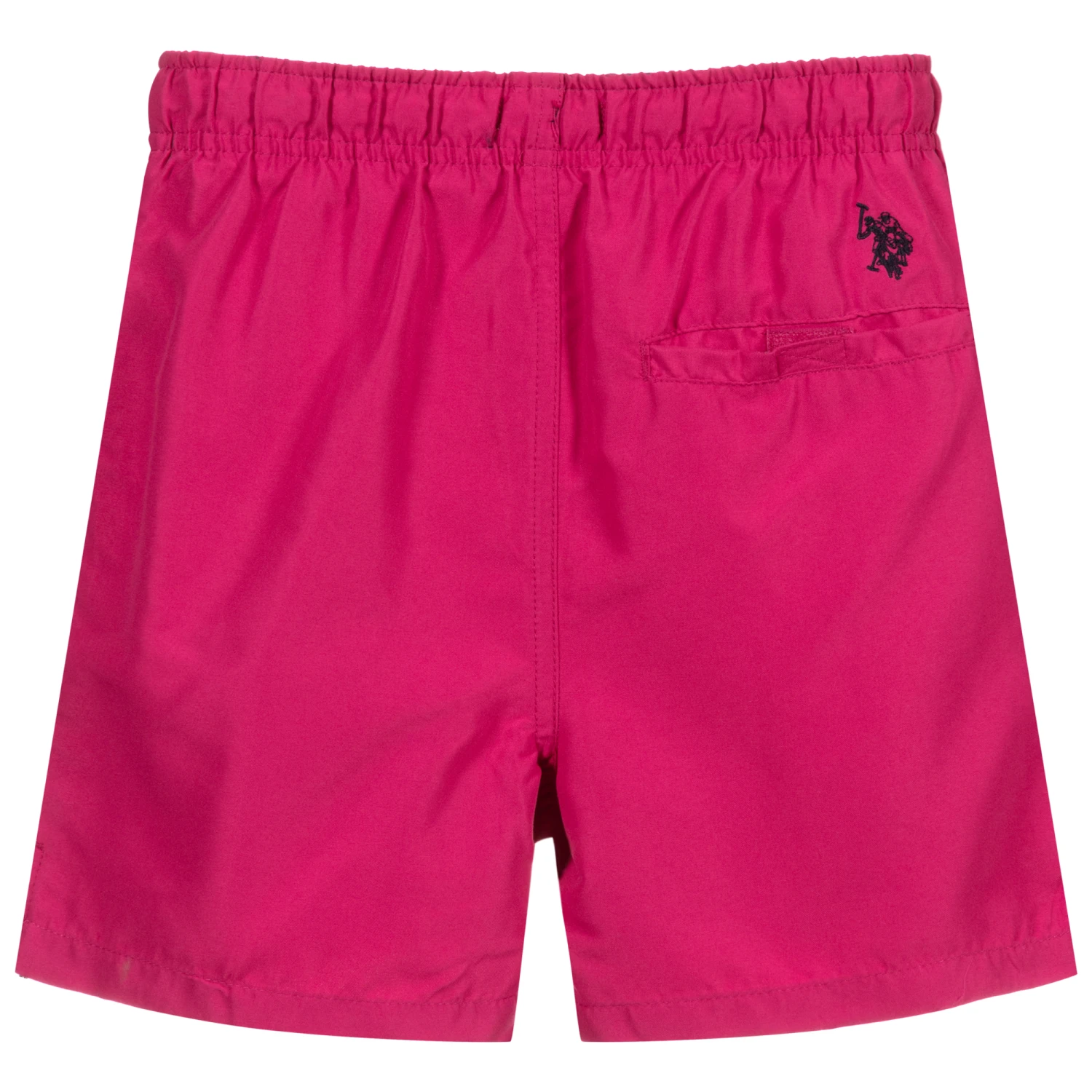 Boys pink swim shorts by U.S. Polo Assn., with a large navy blue logo print on the front. Made in soft polyester, they have a comfortable mesh lining and a drawstring waistband. There are useful side pockets and a velcro-closing pocket on the back.