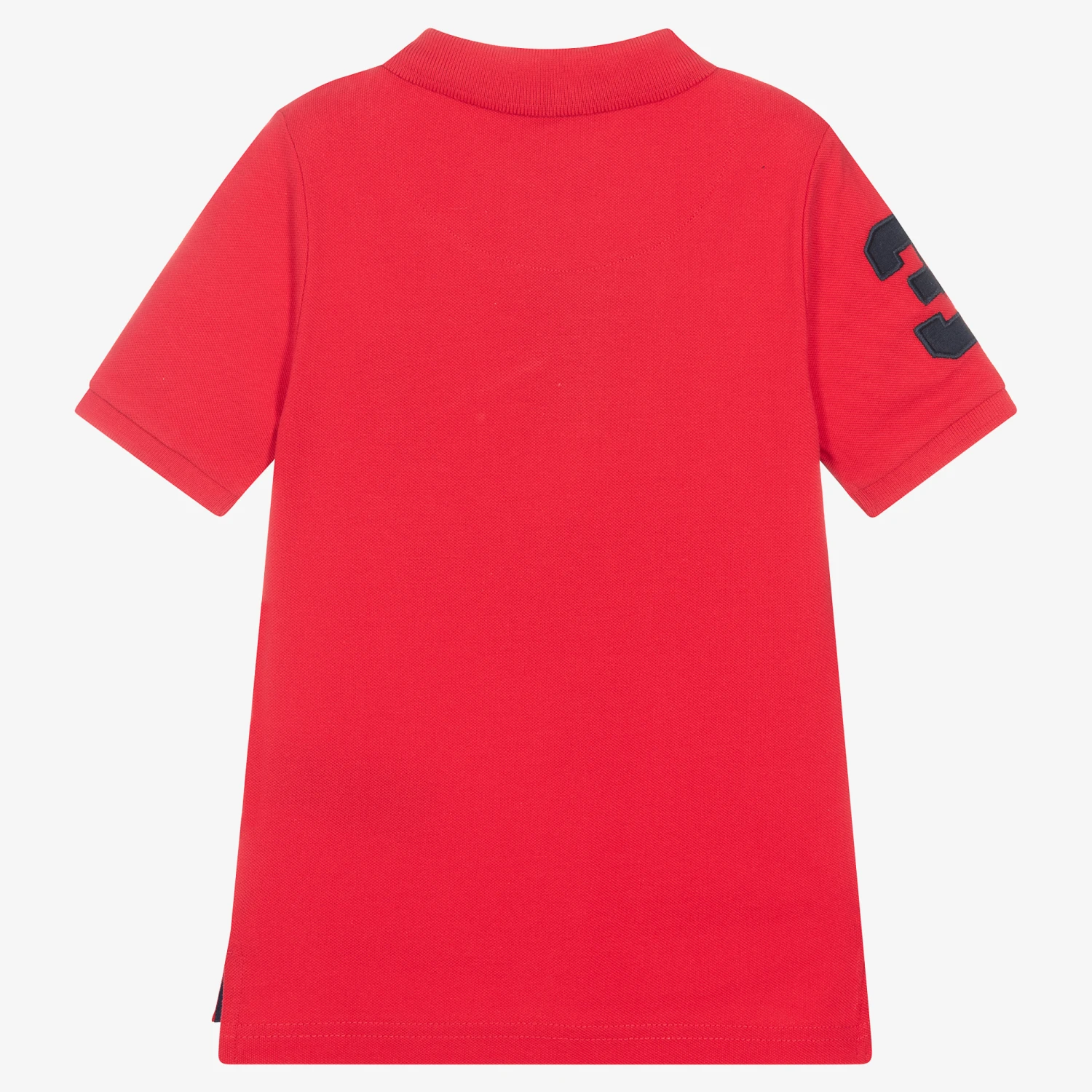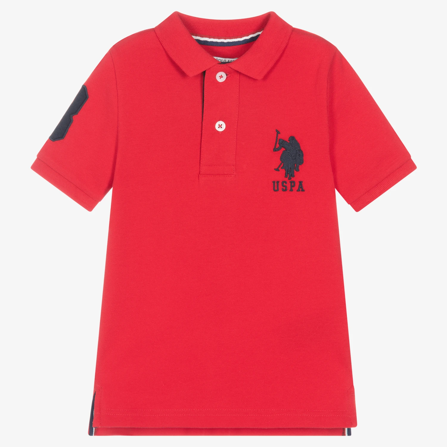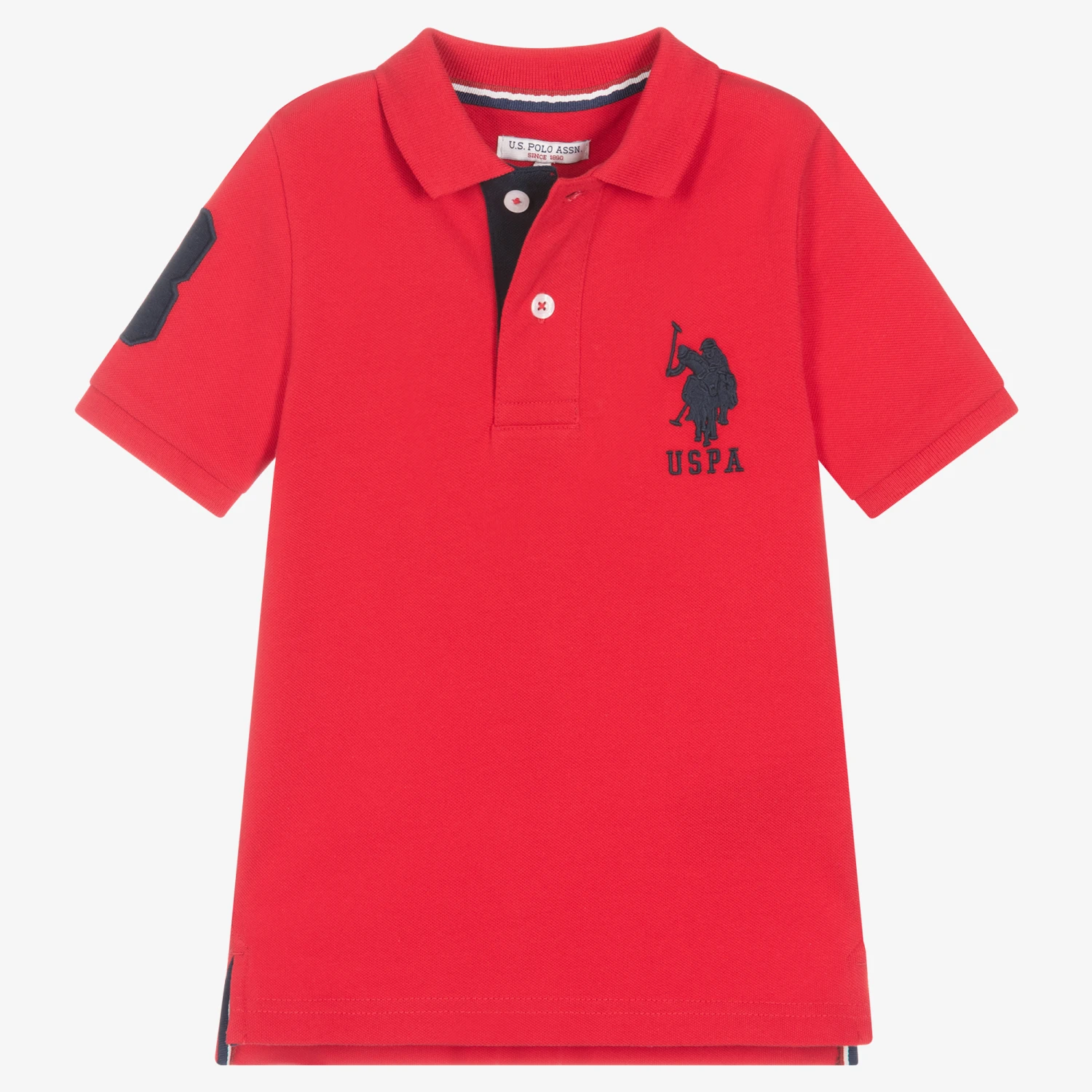 Classic red polo shirt for boys by U.S. Polo Assn., made in soft cotton piqué. The brand’s signature double horseman logo is embroidered on the chest in navy blue, with a number ‘3’ appliquéd on one sleeve. There are branded buttons on the front, and vented sides for ease of movement.