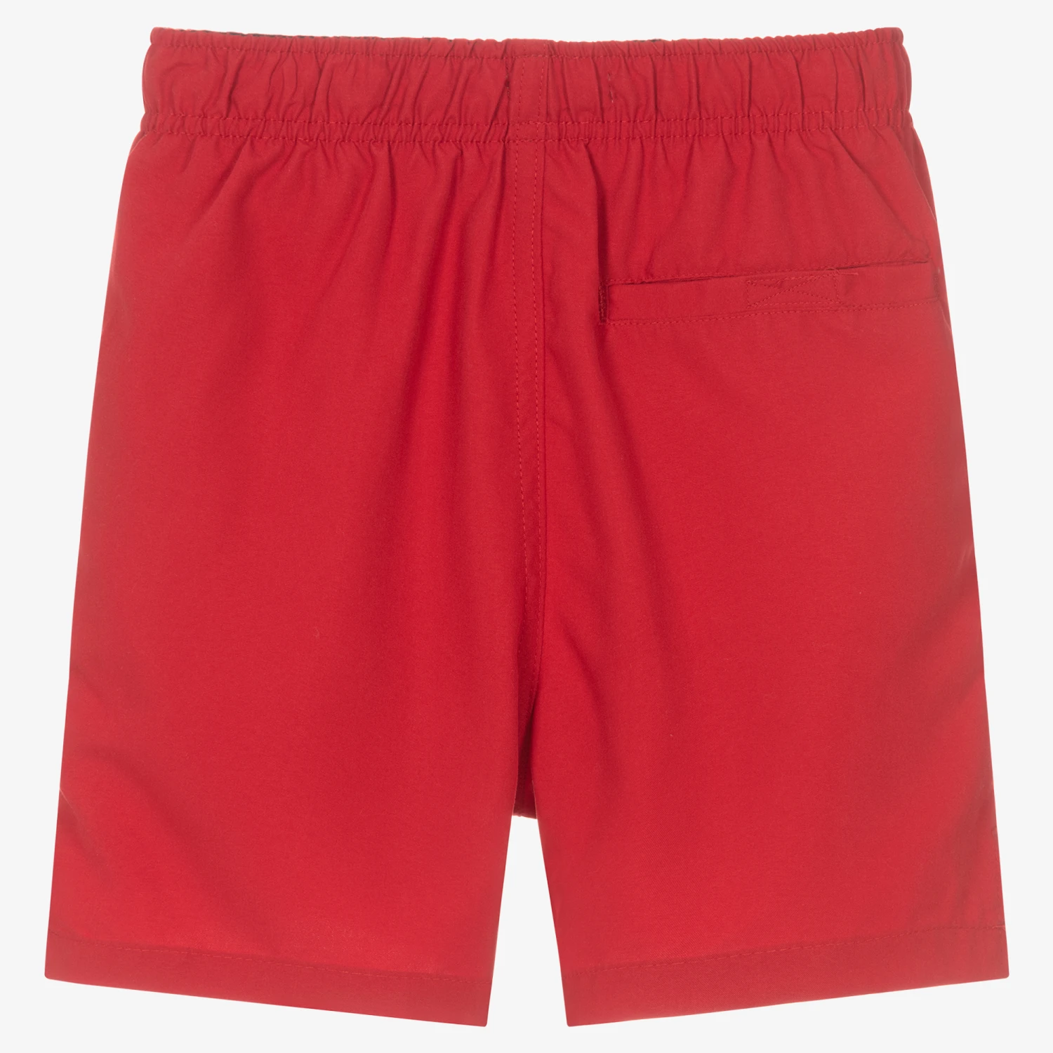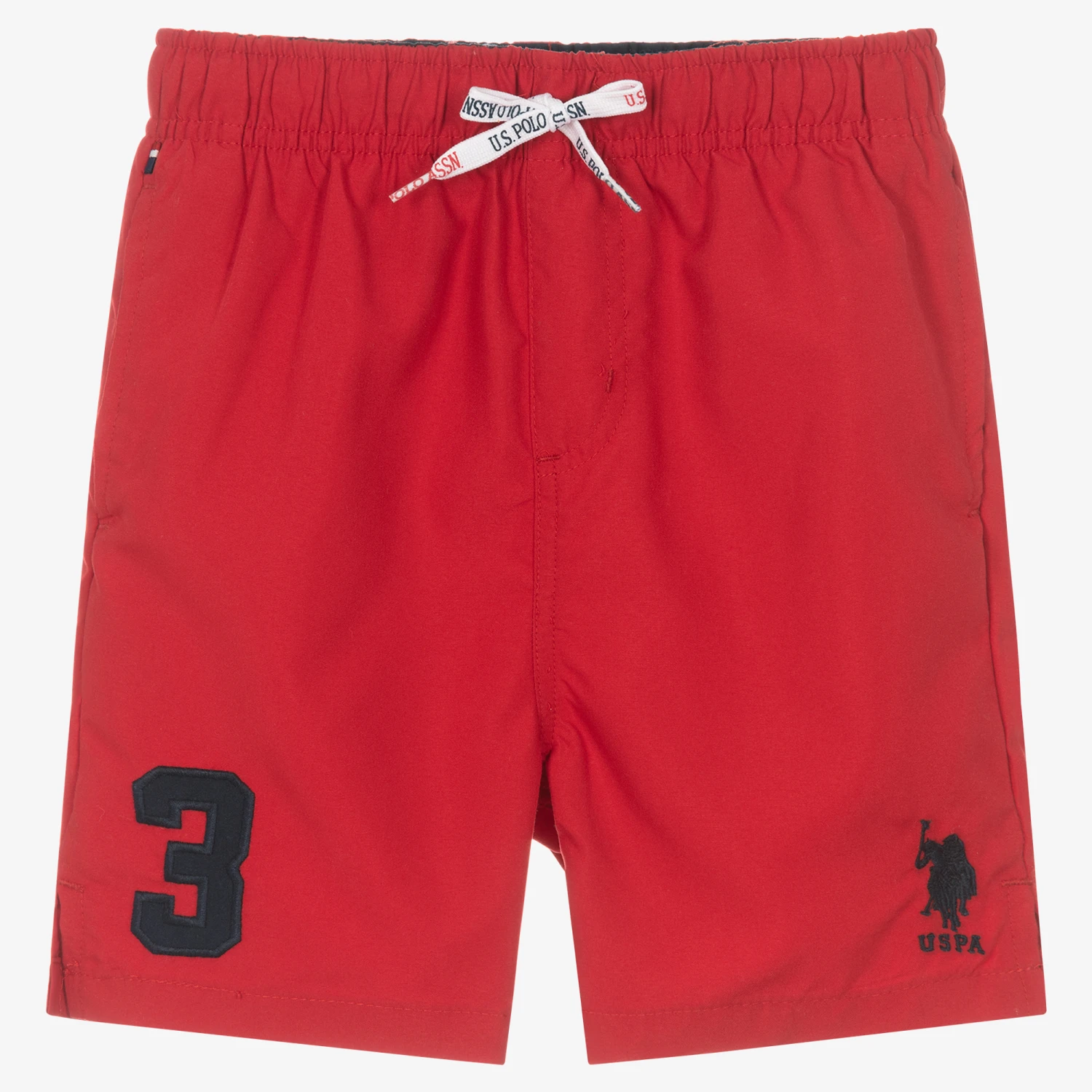 Silky smooth and lightweight, these red swim shorts for boys are by U.S. Polo Assn.. They are lined in soft mesh for comfort and have have an elasticated drawstring waist for a good fit. The brand’s iconic double horseman logo is embroidered on one leg in navy blue, with a number ‘3’ appliquéd on the other.