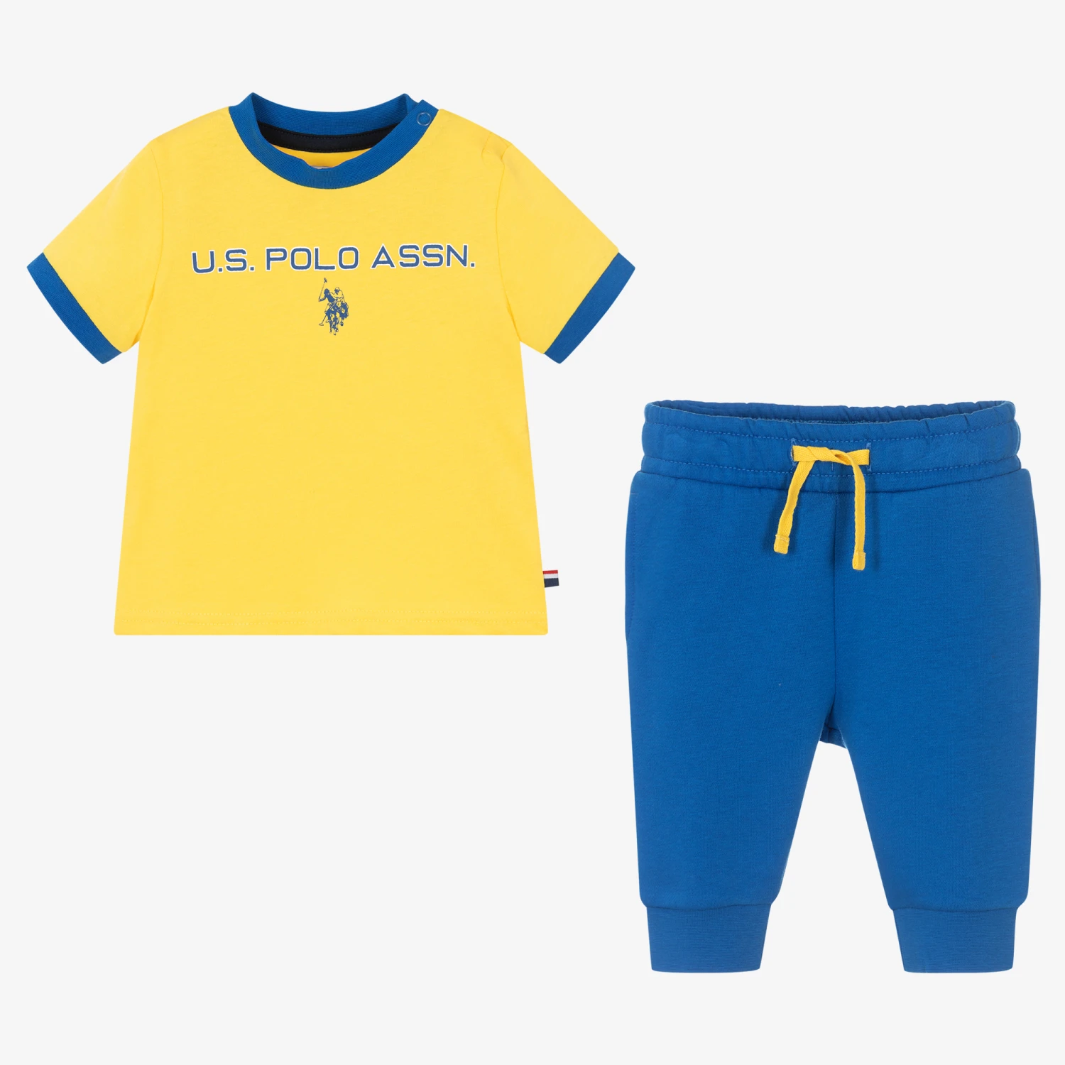 Comfortable for boys, a yellow T-shirt and bright blue trouser set from U.S. Polo Assn., made in soft jersey. The cotton T-shirt has blue trim and a logo print across the chest. There are popper fastenings on the shoulder to assist with dressing. The jogger-style trousers are made in a cosy cotton blend with a soft fleecy inside. They have an elasticated waist with a faux drawstring detail for easy pull-on, and concealed side pockets.
