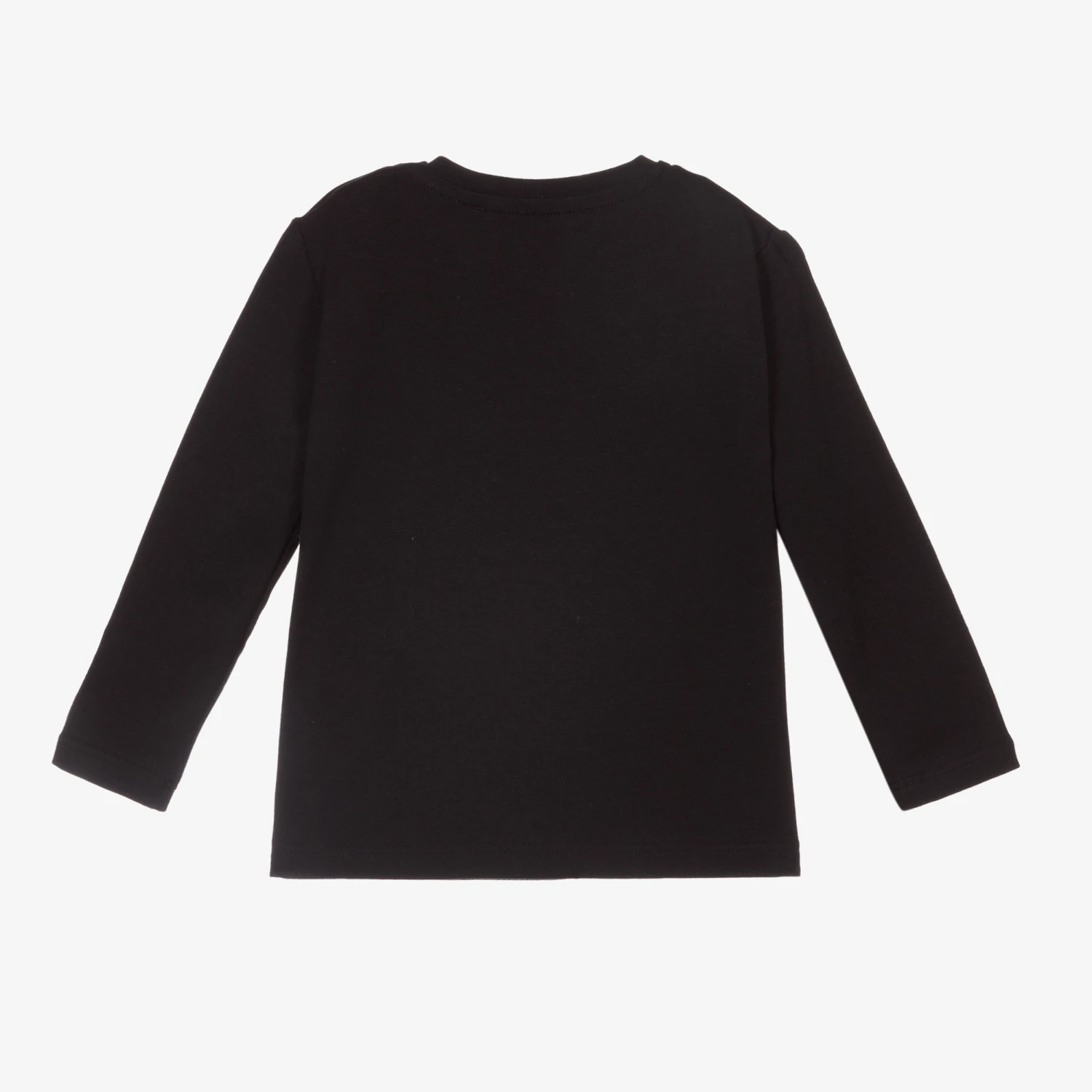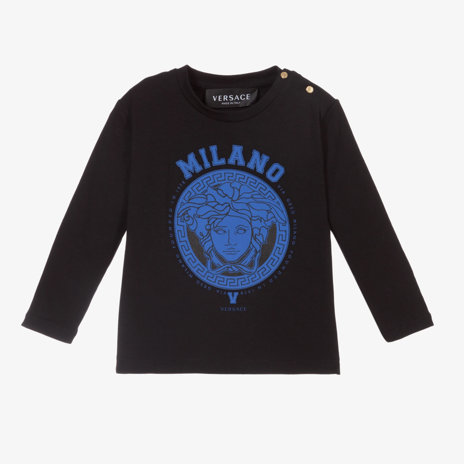 Little boys black cotton jersey top by Italian luxury brand Versace, with the brands iconic royal blue Medusa logo on the front and gold Greek Fret poppers on the shoulder.