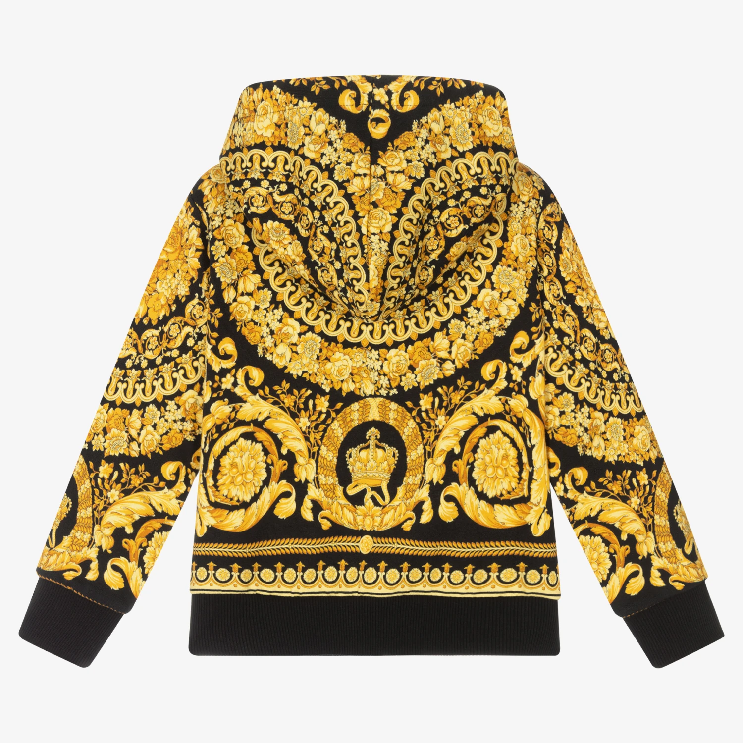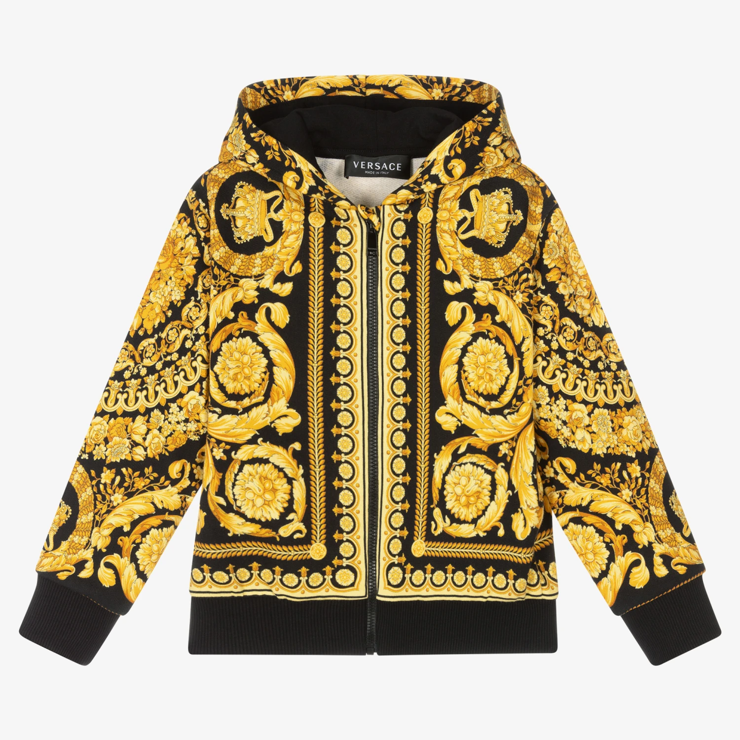 Boys and girls hooded zip-up top for boys by luxury Italian designer Versace, with the brand’s iconic Barocco print in black and gold. It is made in comfortable cotton jersey, with a chin guard on the front and ribbed trims for warmth. It has useful concealed side pockets and a logo embossed front zip fastening.
