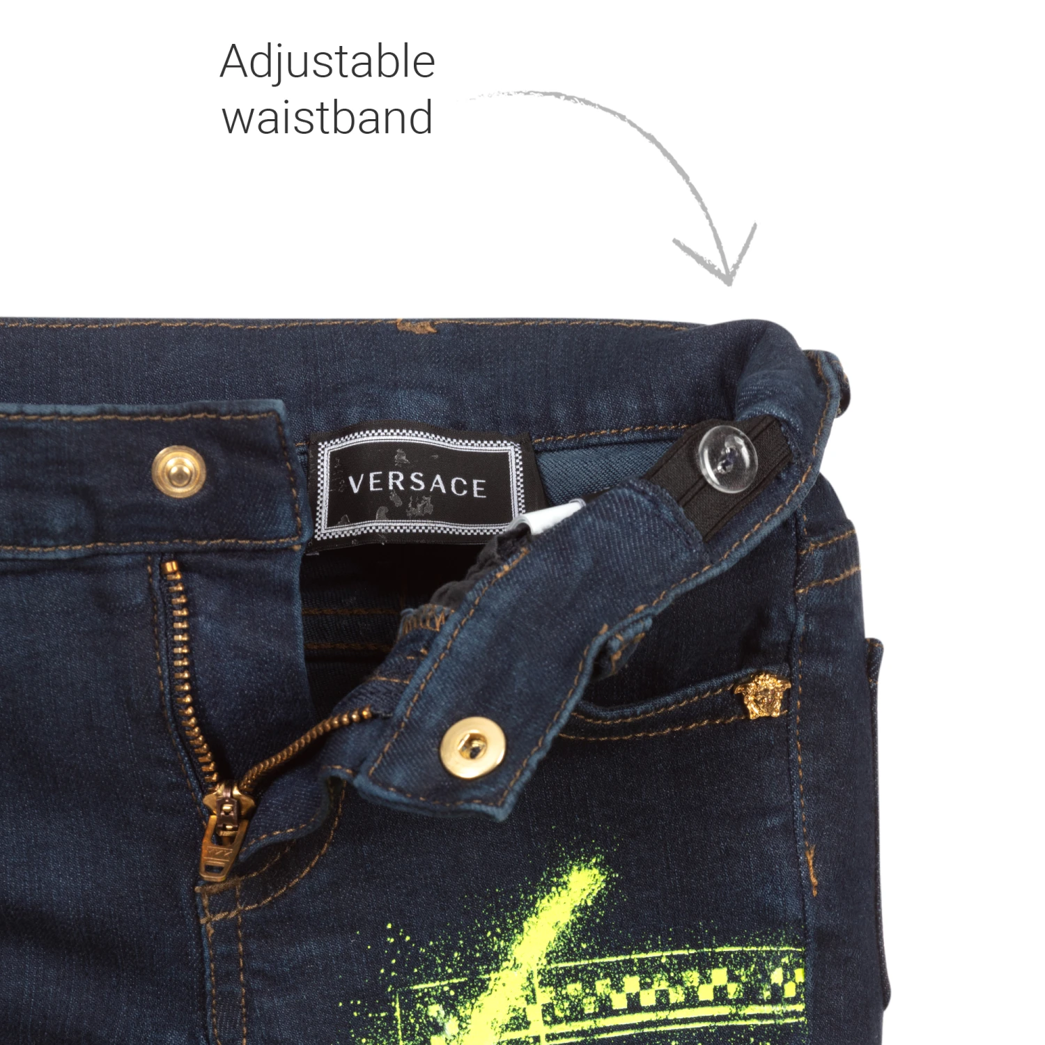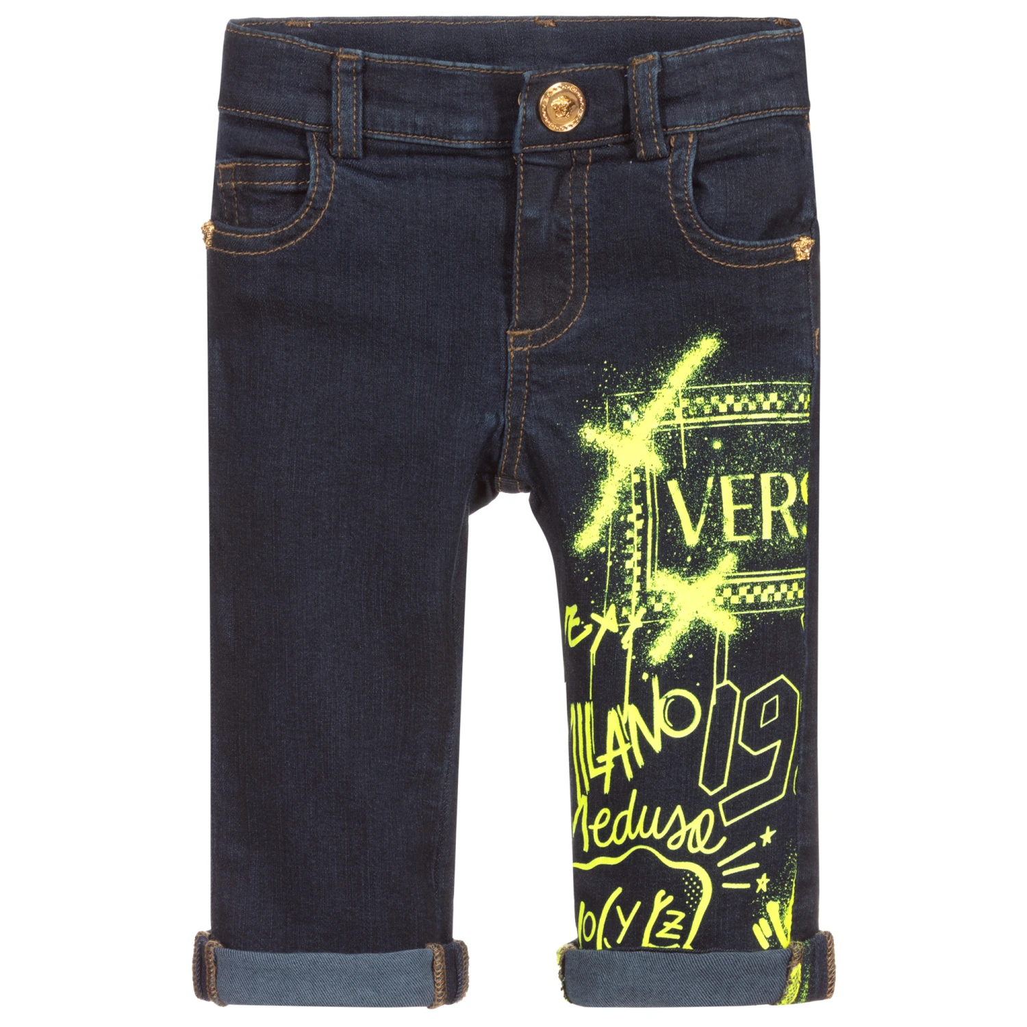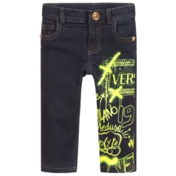 Blue denim jeans for younger boys by luxury Italian designer Versace, with neon yellow grafitti-style logos on one leg. They have a shiny gold Medusa popper fastening with matching rivets and a useful, adjustable waistband.