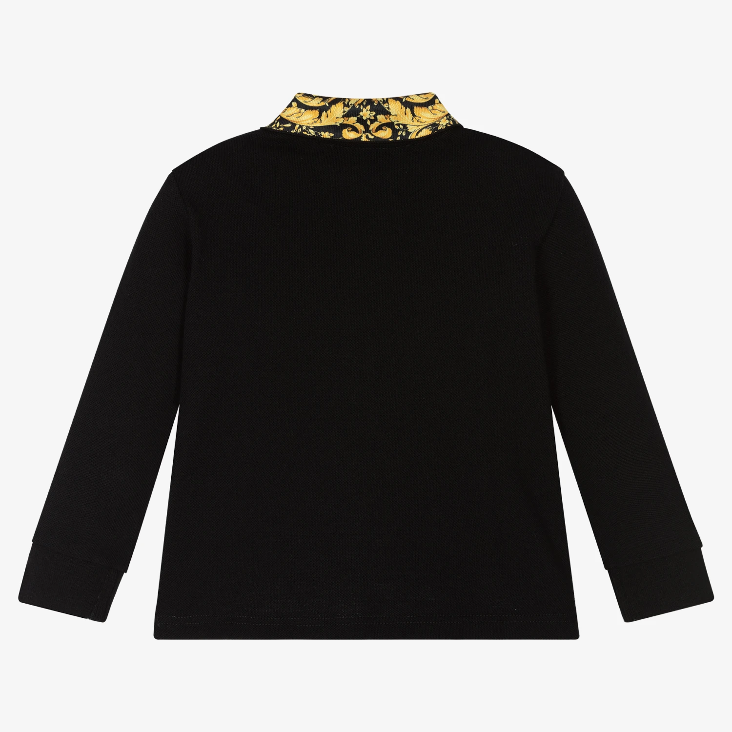 Black polo shirt for boys by luxury Italian brand Versace. The designer’s unmistakable gold Barocco print is on the collar and their iconic Mudusa logo is embroidered on the chest in tonal black. Made in soft cotton piqué, the top fastens with buttons on the front.