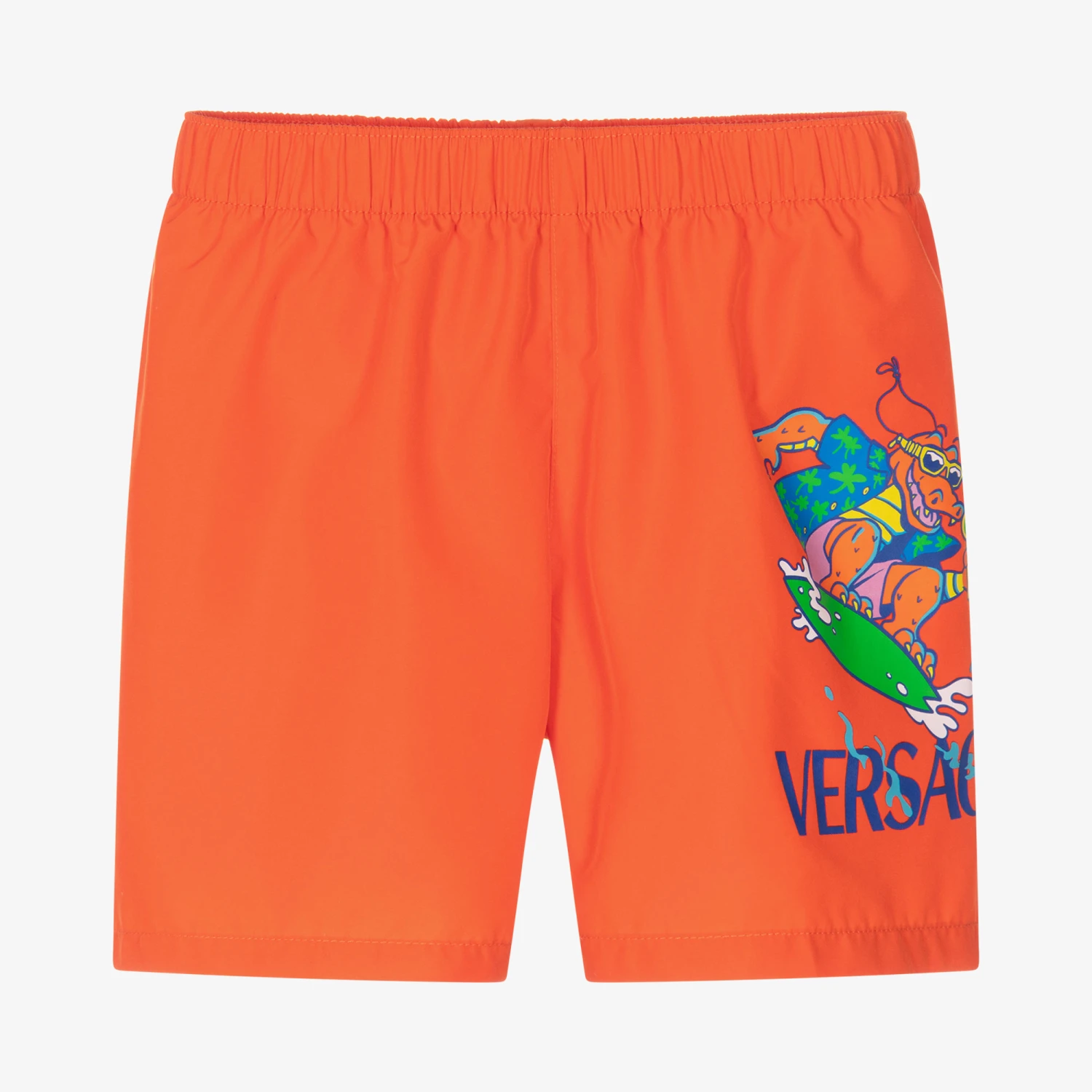 Playful bright orange swim shorts for boys from Italian luxury brand Versace, made in silky and lightweight fabric. Great for making a statement at the beach, these vibrant shorts have a colourful surfing crocodile print on the front, with blue logo lettering. The soft pants lining ensures lasting comfort.