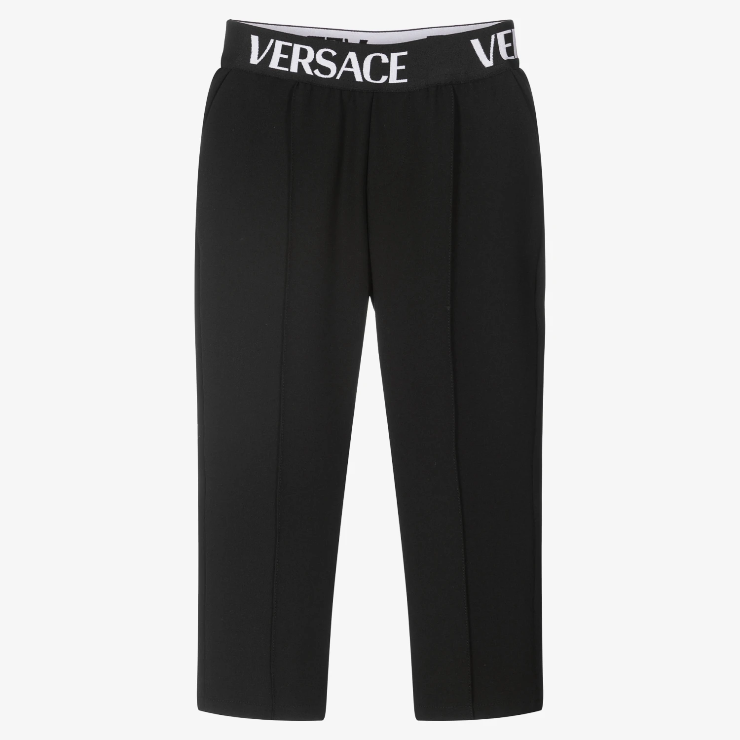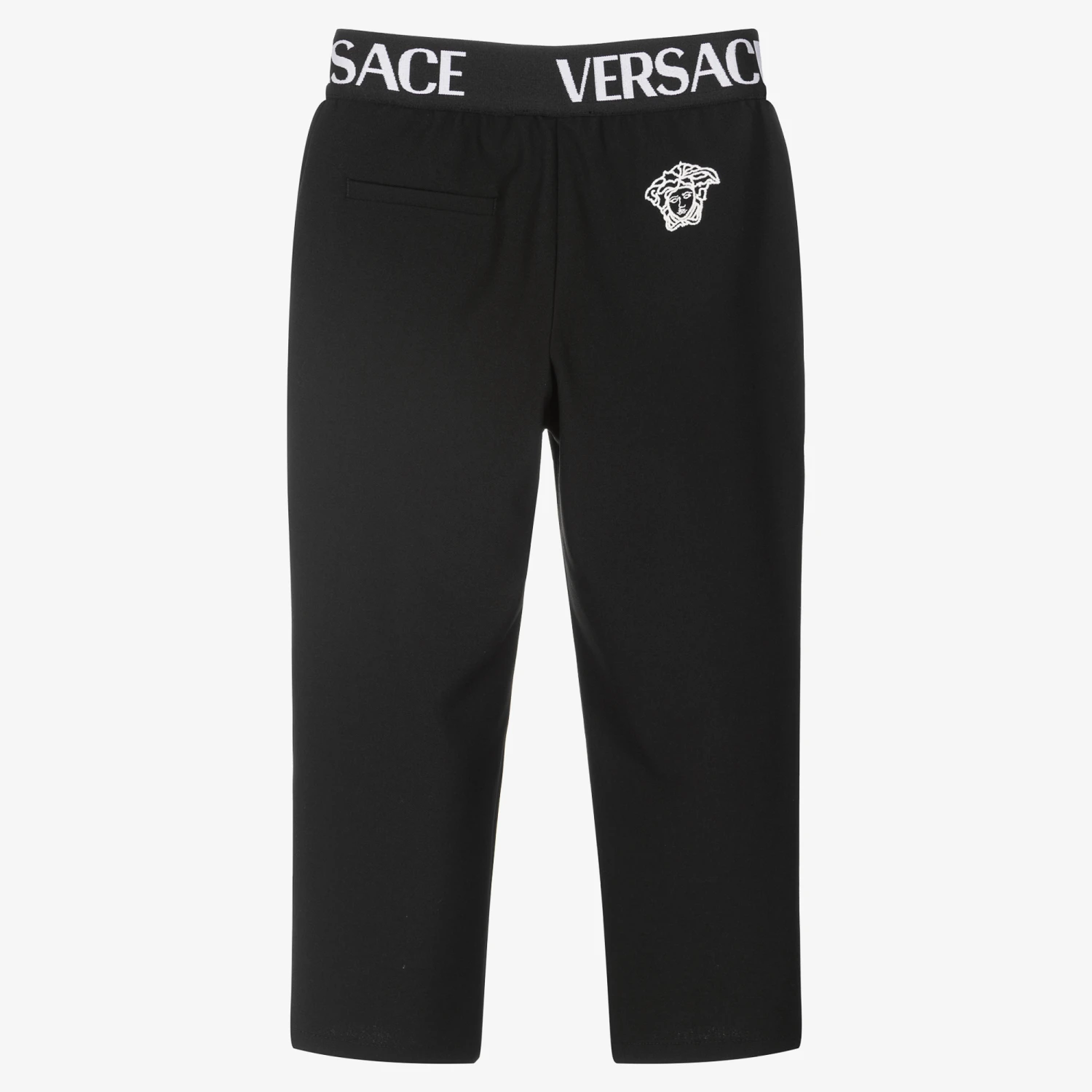 Boys smart black trousers from Italian luxury designer Versace, made in a soft viscose blend. They have an elasticated logo jacquard waistband, with stitched seams and slanted pockets on the front. On the back, there is a welt pocket and the brand’s iconic Medusa logo in white embroidery.