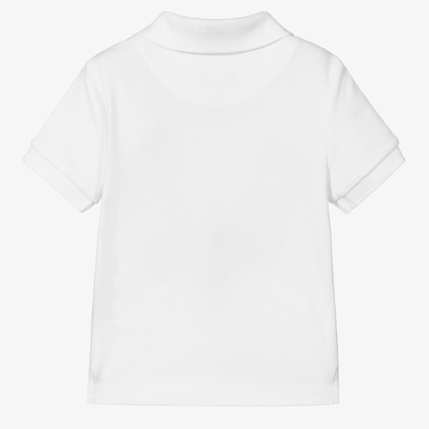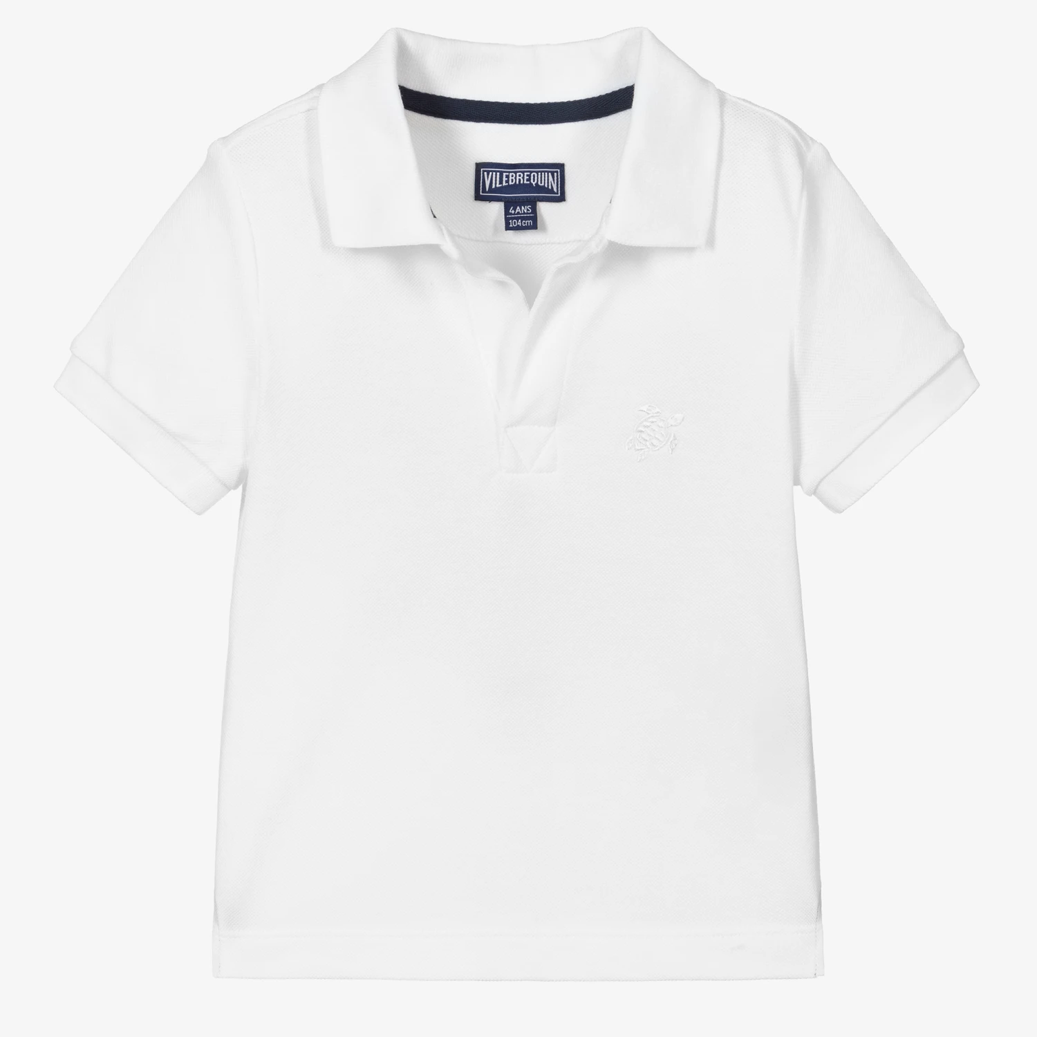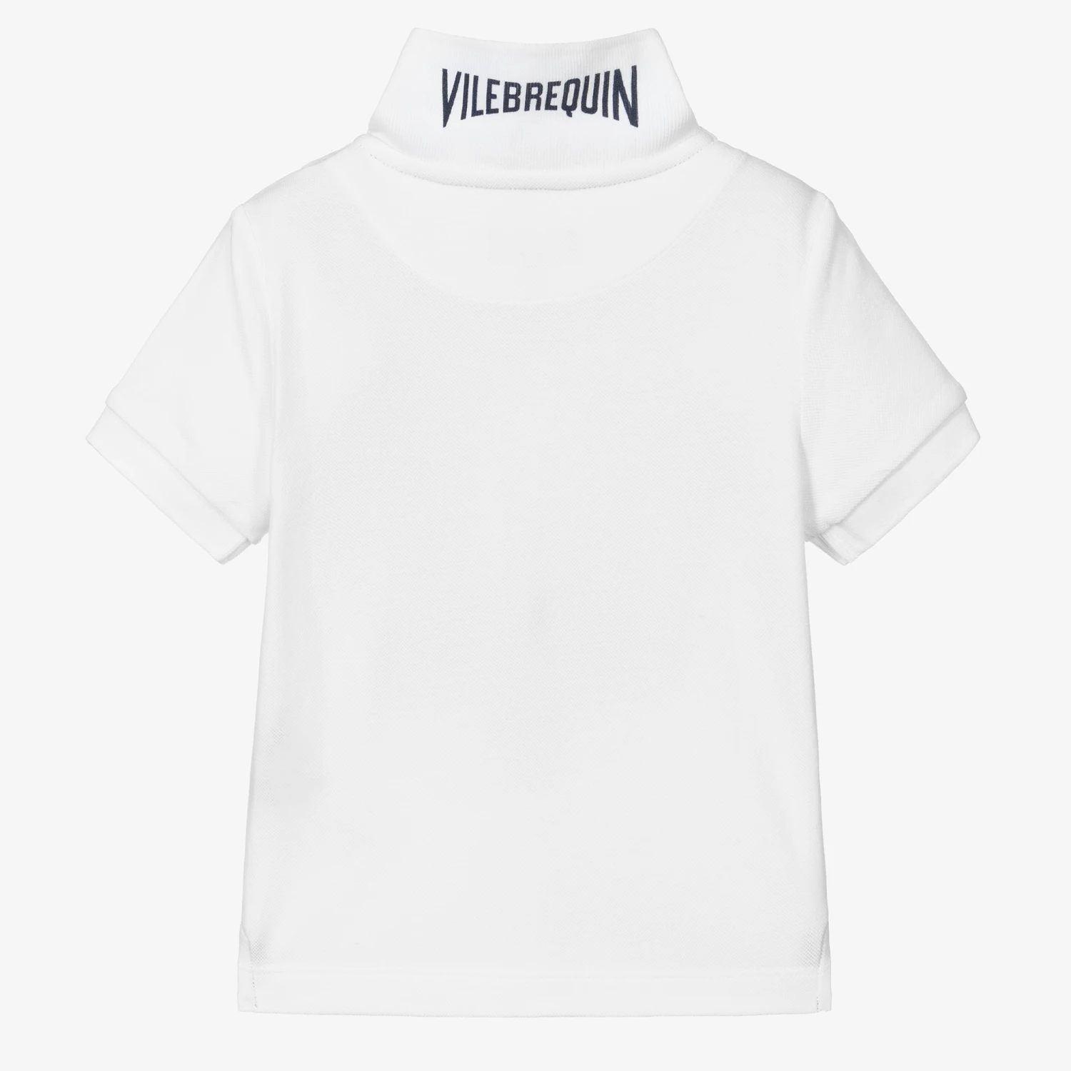 Boys white cotton piqué polo shirt by Vilebrequin. The style has an open V-neckline and the brand’s tone-on-tone embroidered turtle logo is at the chest and the designer’s logo is printed in navy blue underneath the collar.