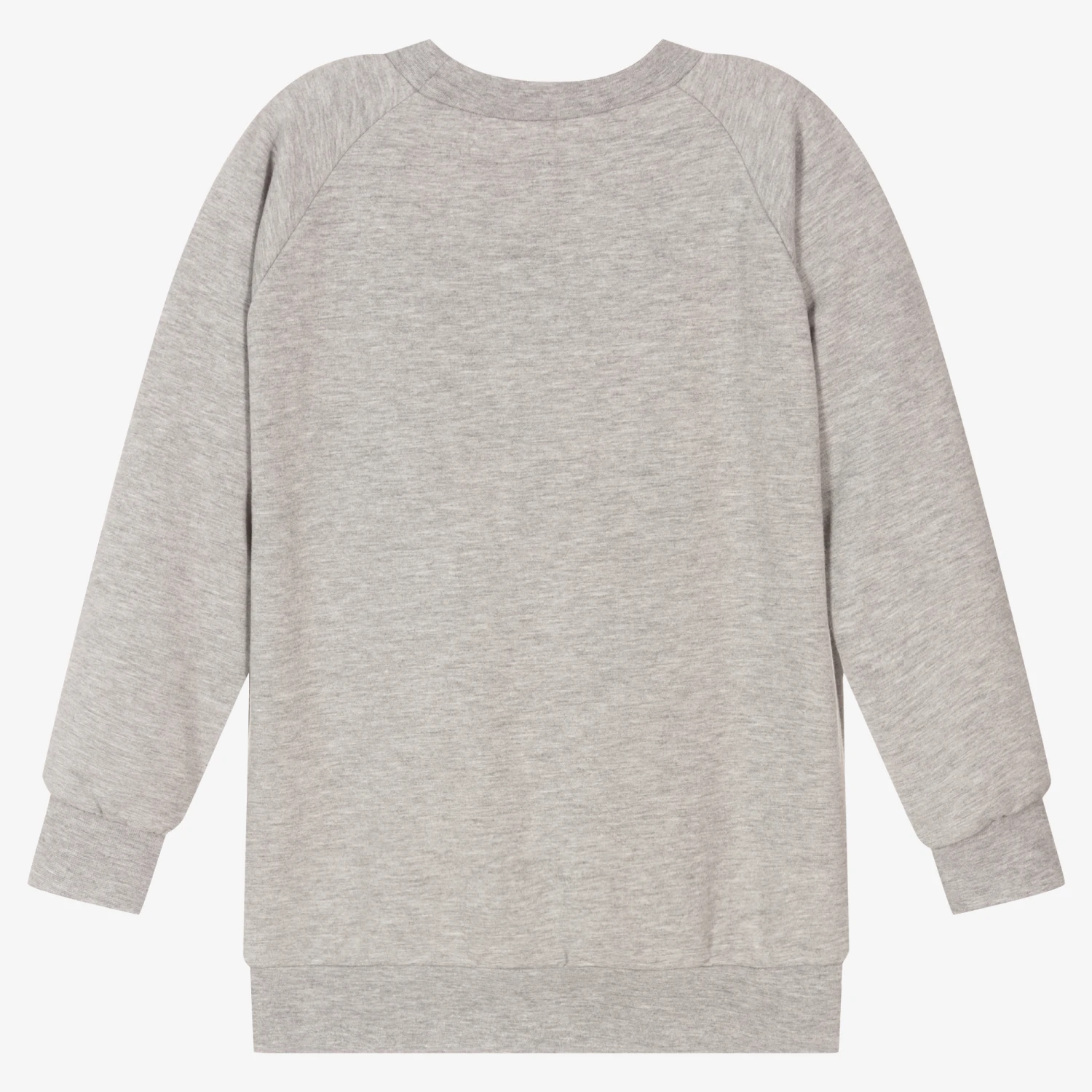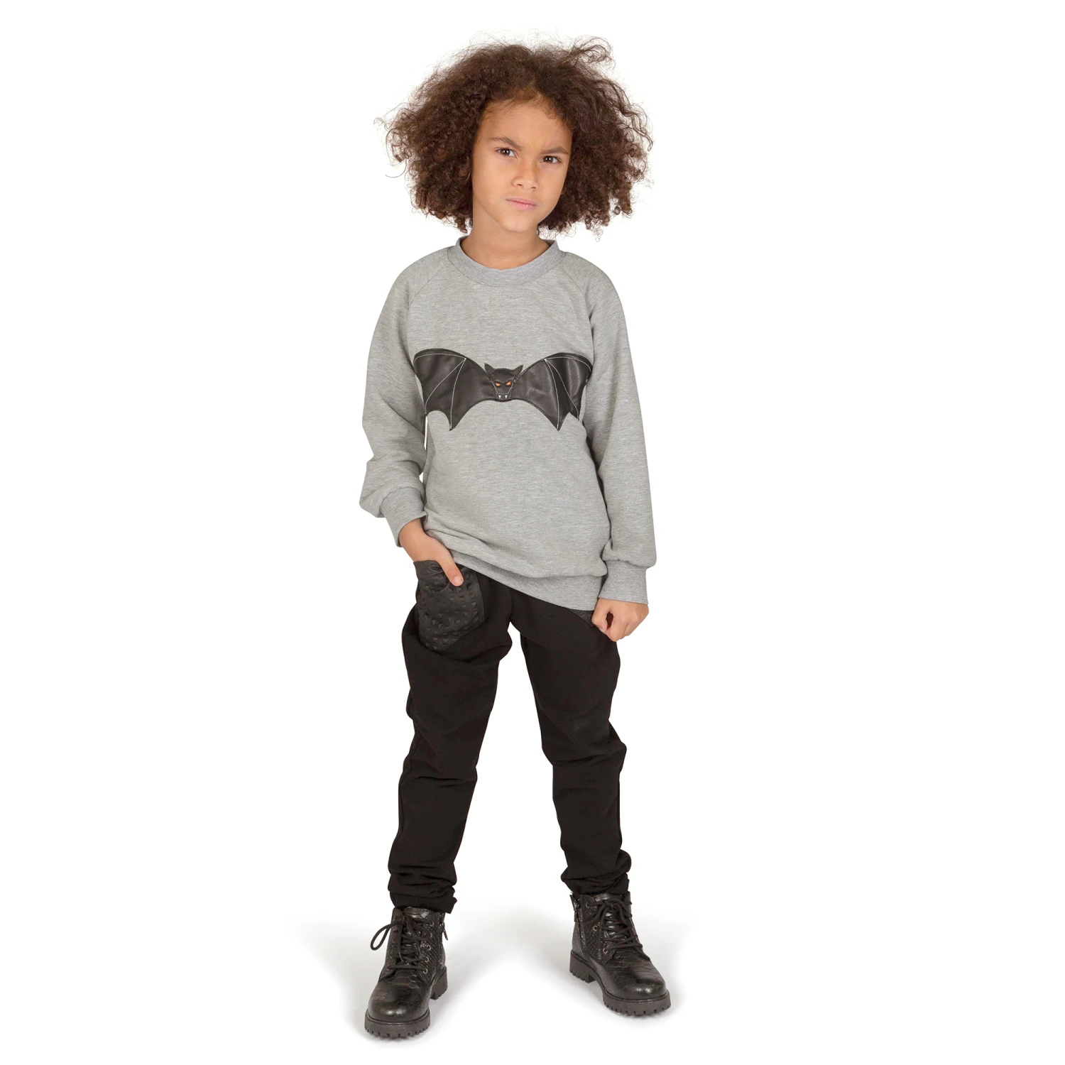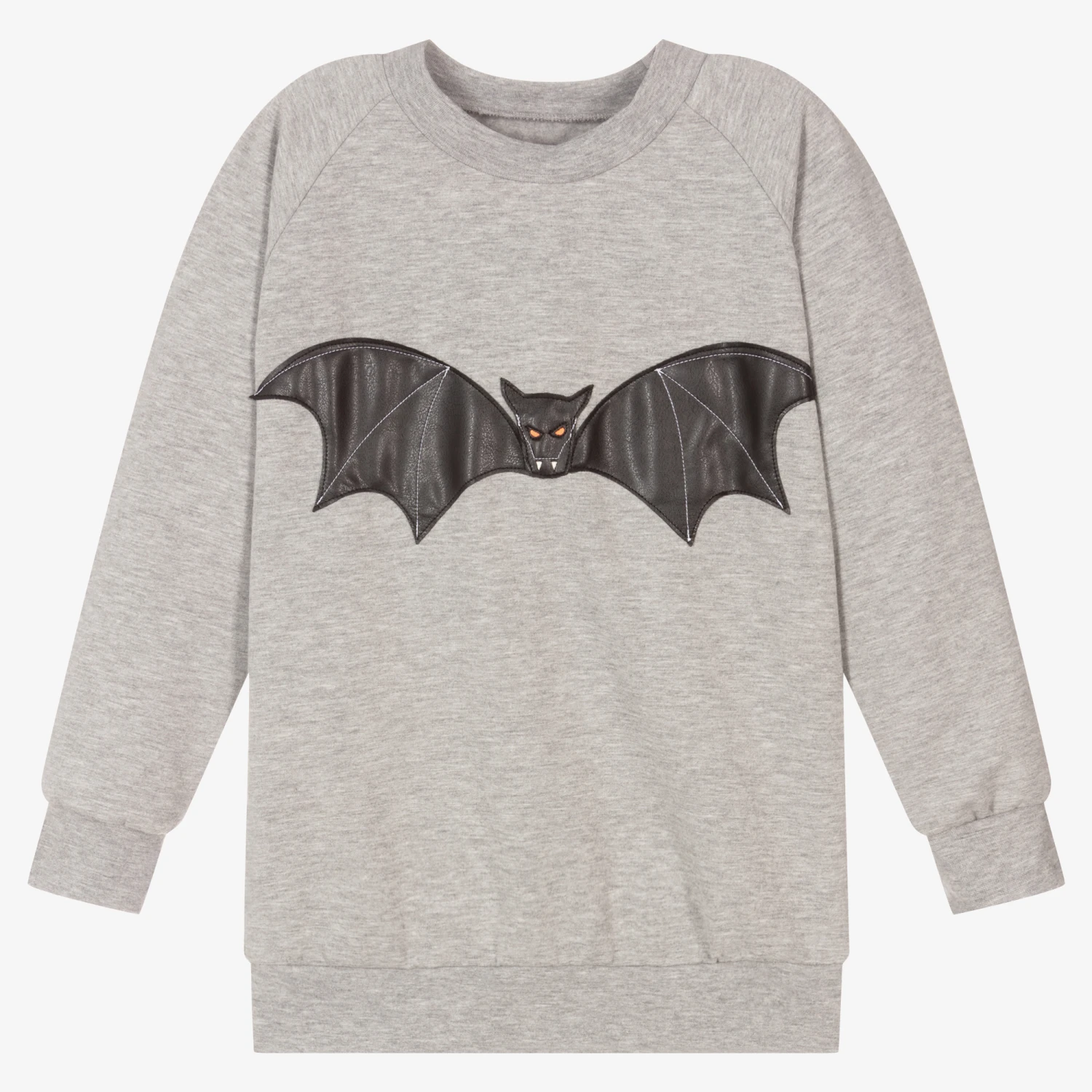 Grey marl sweatshirt for boys from Danish brand Wauw Capow by Bangbang. Made in comfortable organic cotton jersey with a fleecy inside and raglan sleeves, it has a black faux leather bat on the front.