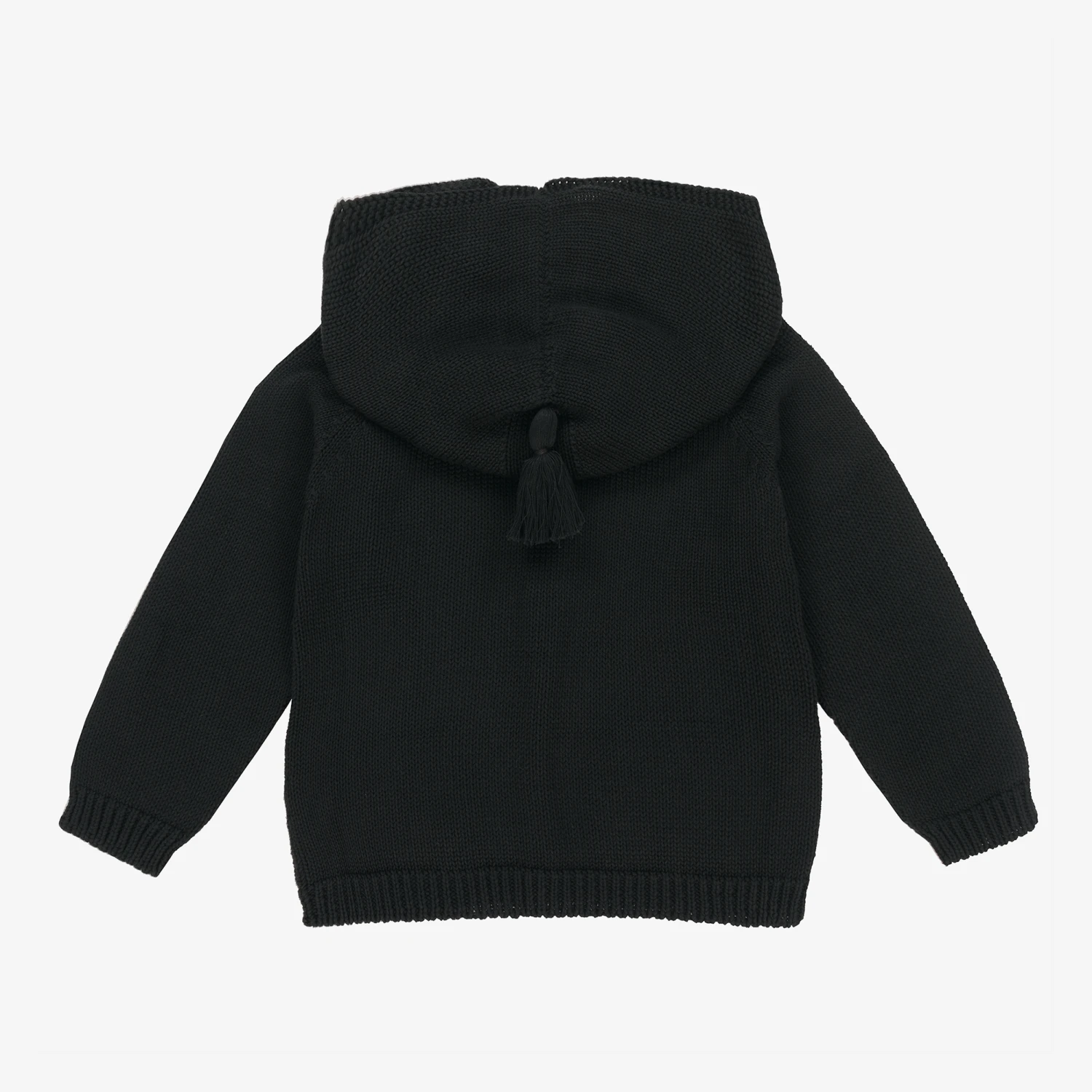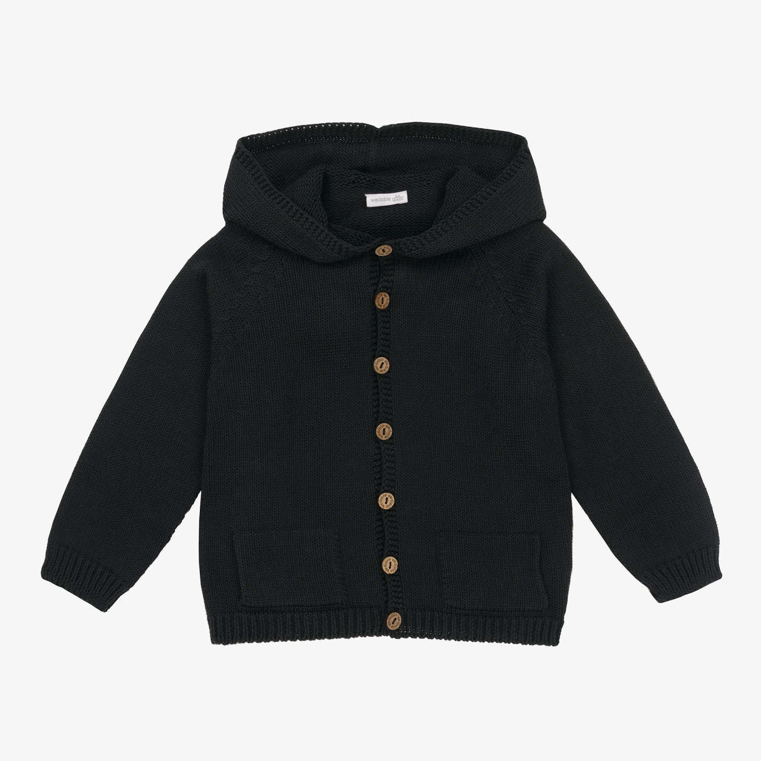 Grey hooded cardigan for younger boys and girls by Portuguese brand, Wedoble. Knitted in soft organic cotton, it has a tassel on the hood, branded button fastenings and two front pockets.