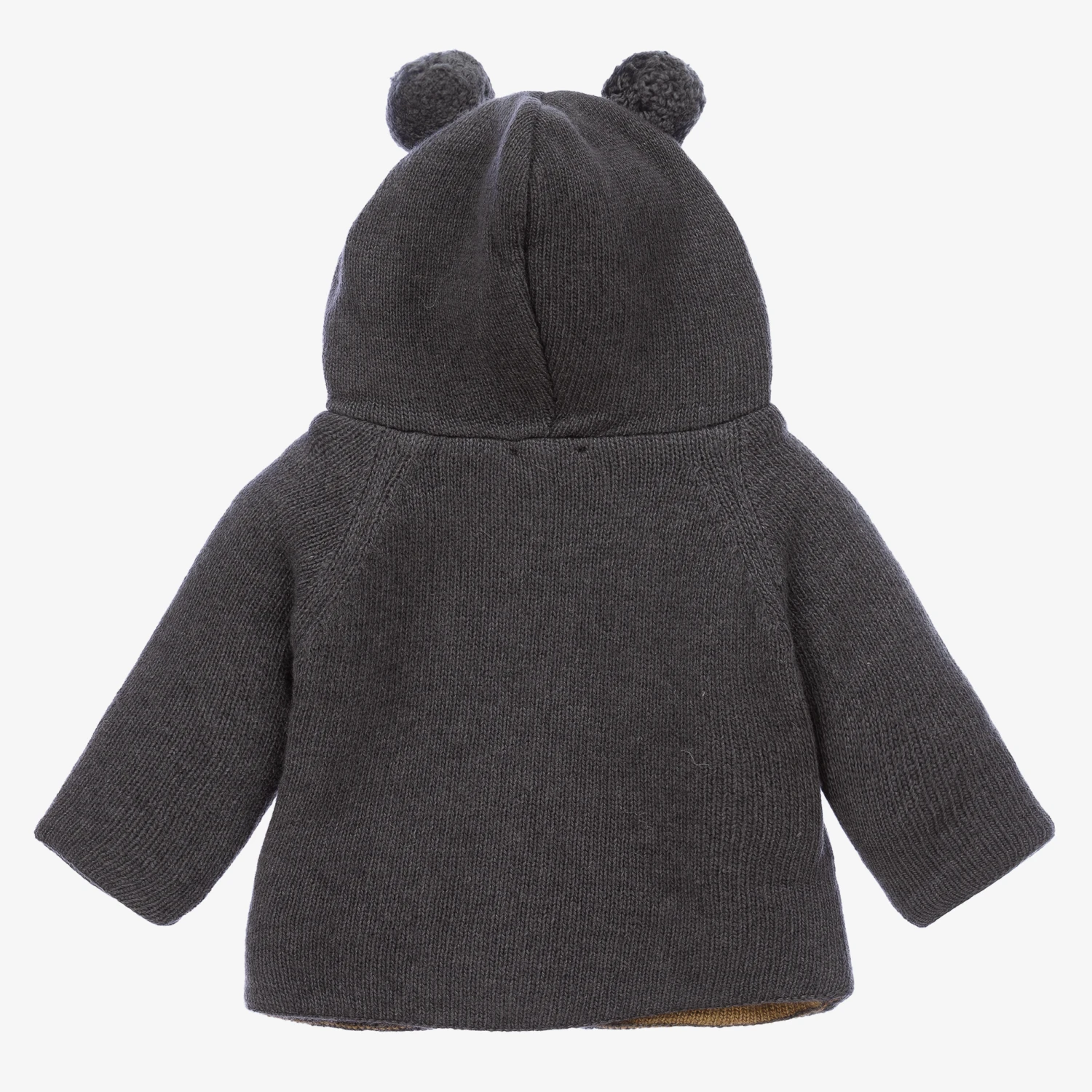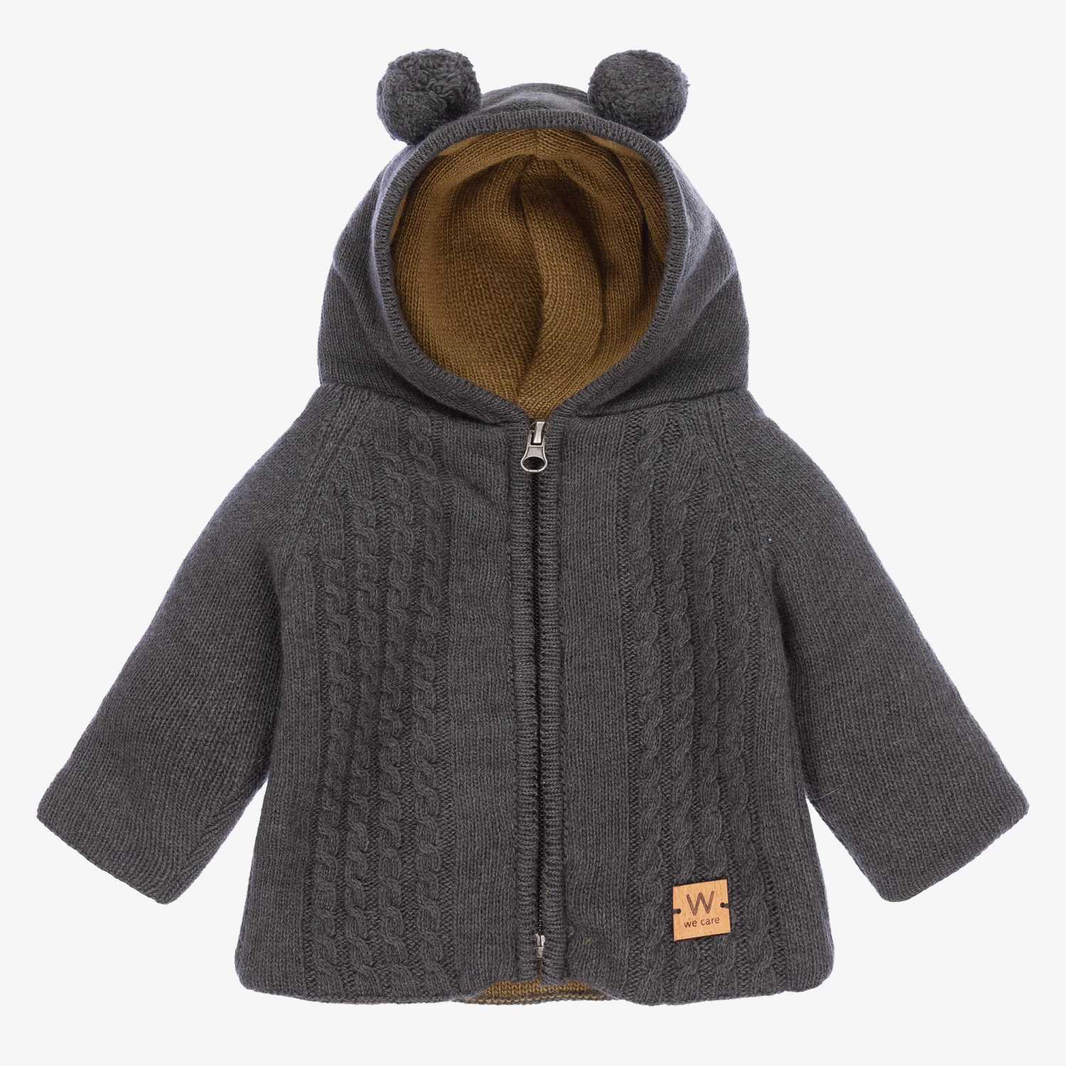 Grey zip-up top for boys and girls by classic Portuguese brand Wedoble, knitted in a cosy Merino wool, cashmere and viscose blend. It has a cable knit pattern on the front, a logo tab by the hemline and cute bobble ears on the hood. It has a knitted, mustard yellow lining and fastens with a front zip.