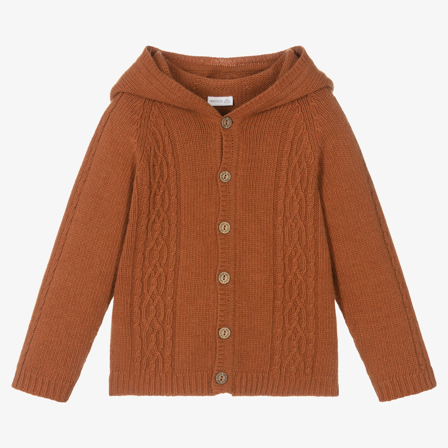 Lovely for little boys and girls, this burnt orange hooded cardigan is by Wedoble. Knitted in a beautifully soft blend of Merino wool and cashmere, it features classic cable stitching on the front. There are branded wooden button fastenings, with a cute tassel on top of the hood.