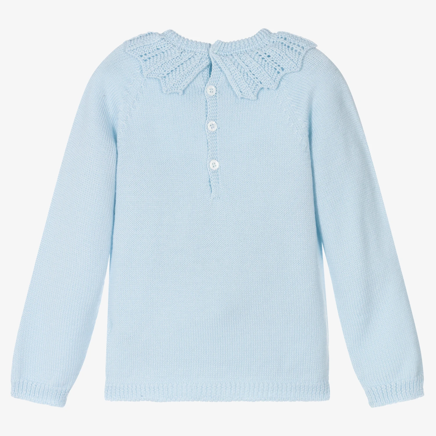 Pale blue jumper for little boys and girls by Portuguese brand, Wedoble. Knitted in soft wool, it has a lovely patterned collar and a sweet logo charm on the front. Branded button fastenings on the back make changing quick and easy.