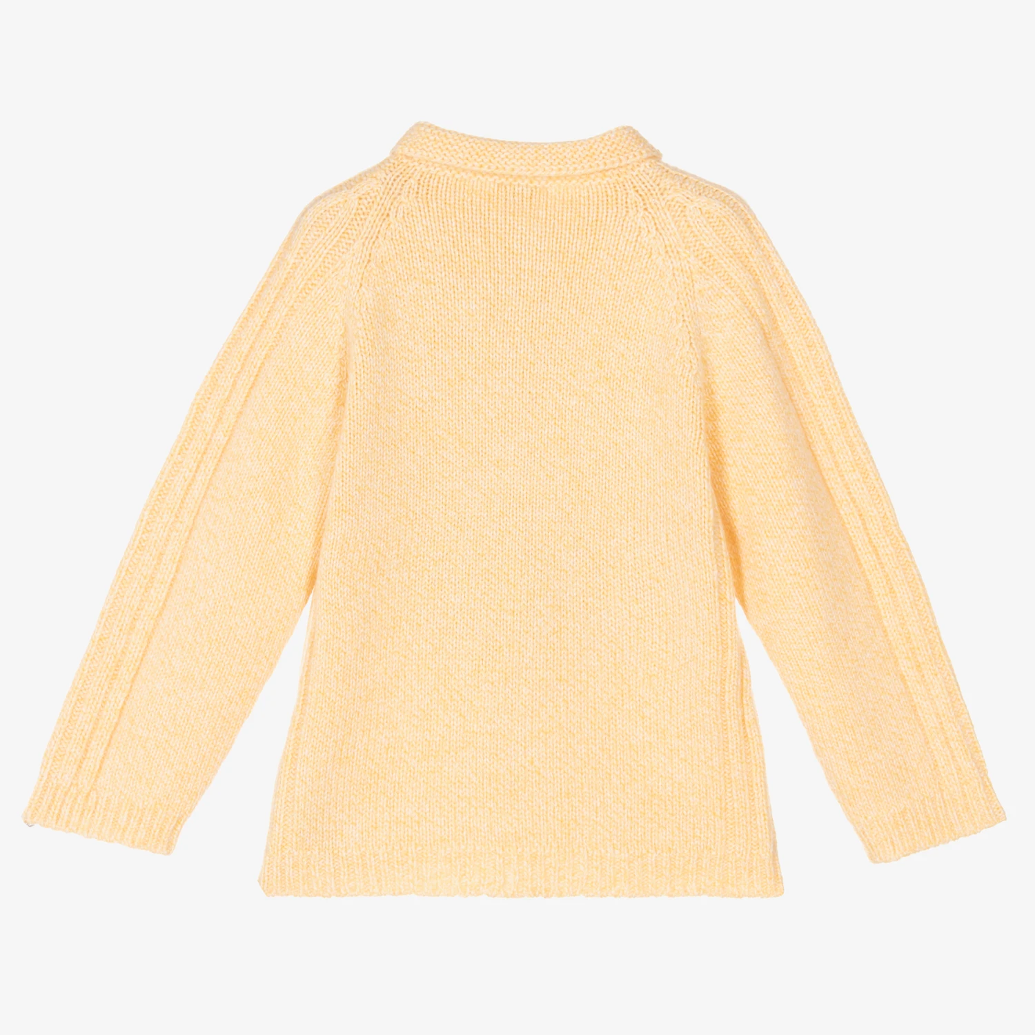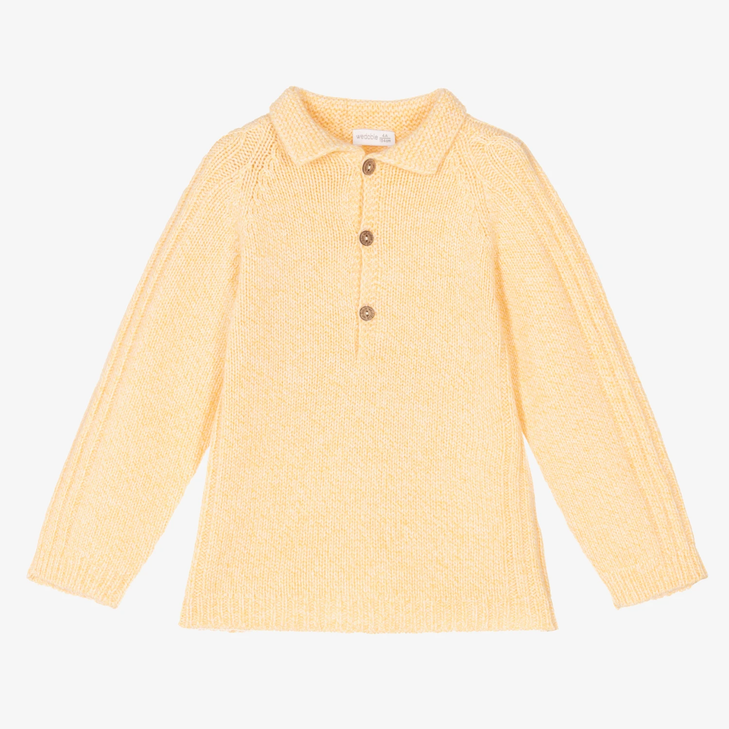 Beautifully soft and cosy for boys and girls, a yellow knitted jumper from Wedoble. Made from a luxurious wool and cashmere blend, this classic casual style has a knitted collar and branded coconut button fastenings on the front. It has a smart ribbed pattern on the sides and along the sleeves.