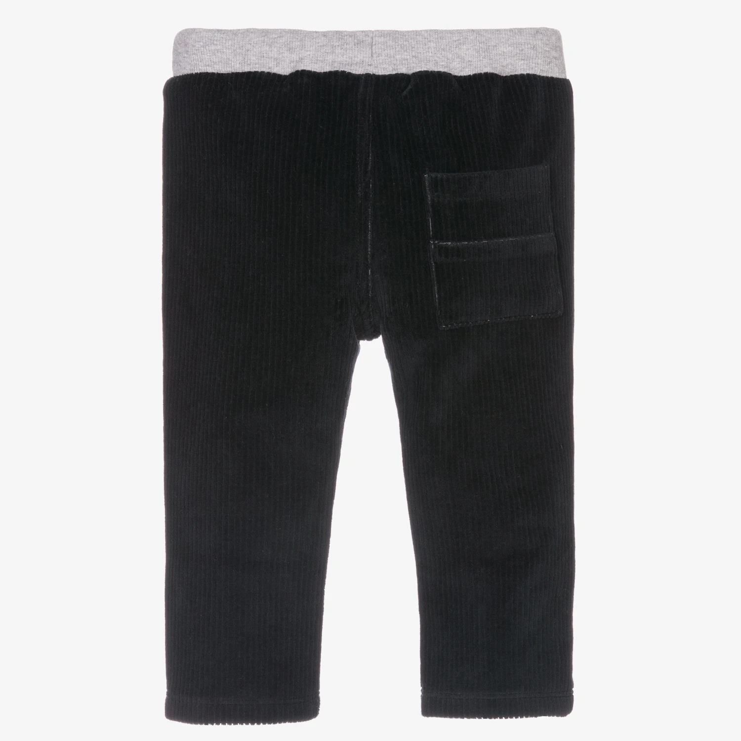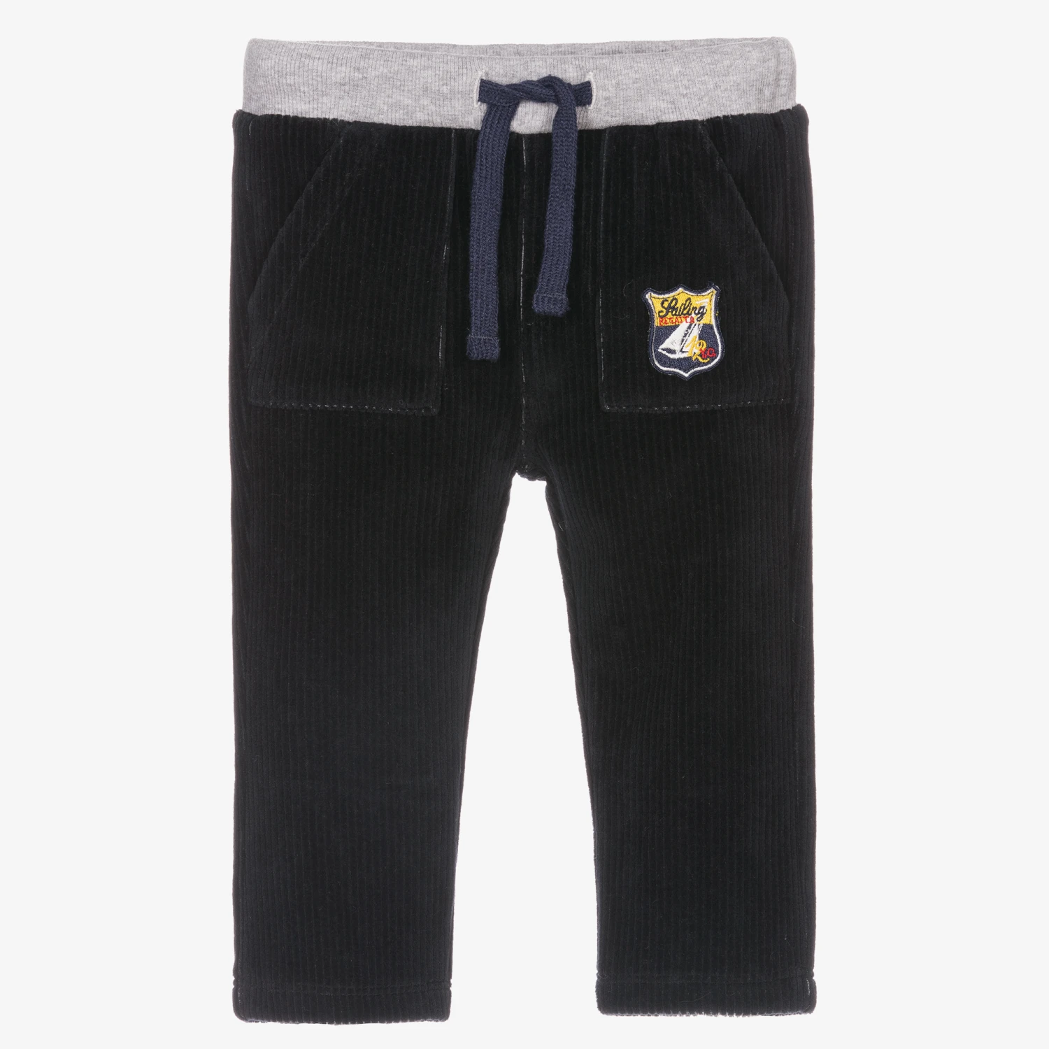 Soft and comfortable for younger boys, these navy blue casual trousers from Week-end à la mer are made in stretchy velour corduroy. They have a grey ribbed waistband with a drawstring tie, and patch pockets with an embroidered sailing regatta badge.