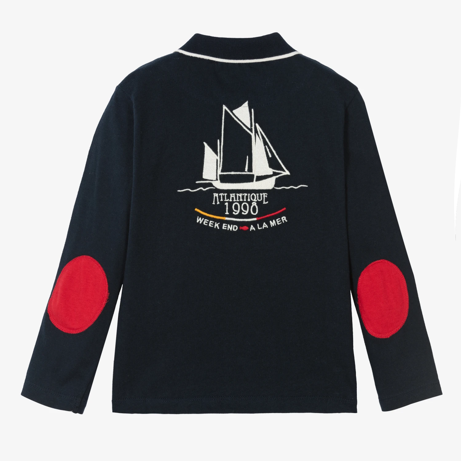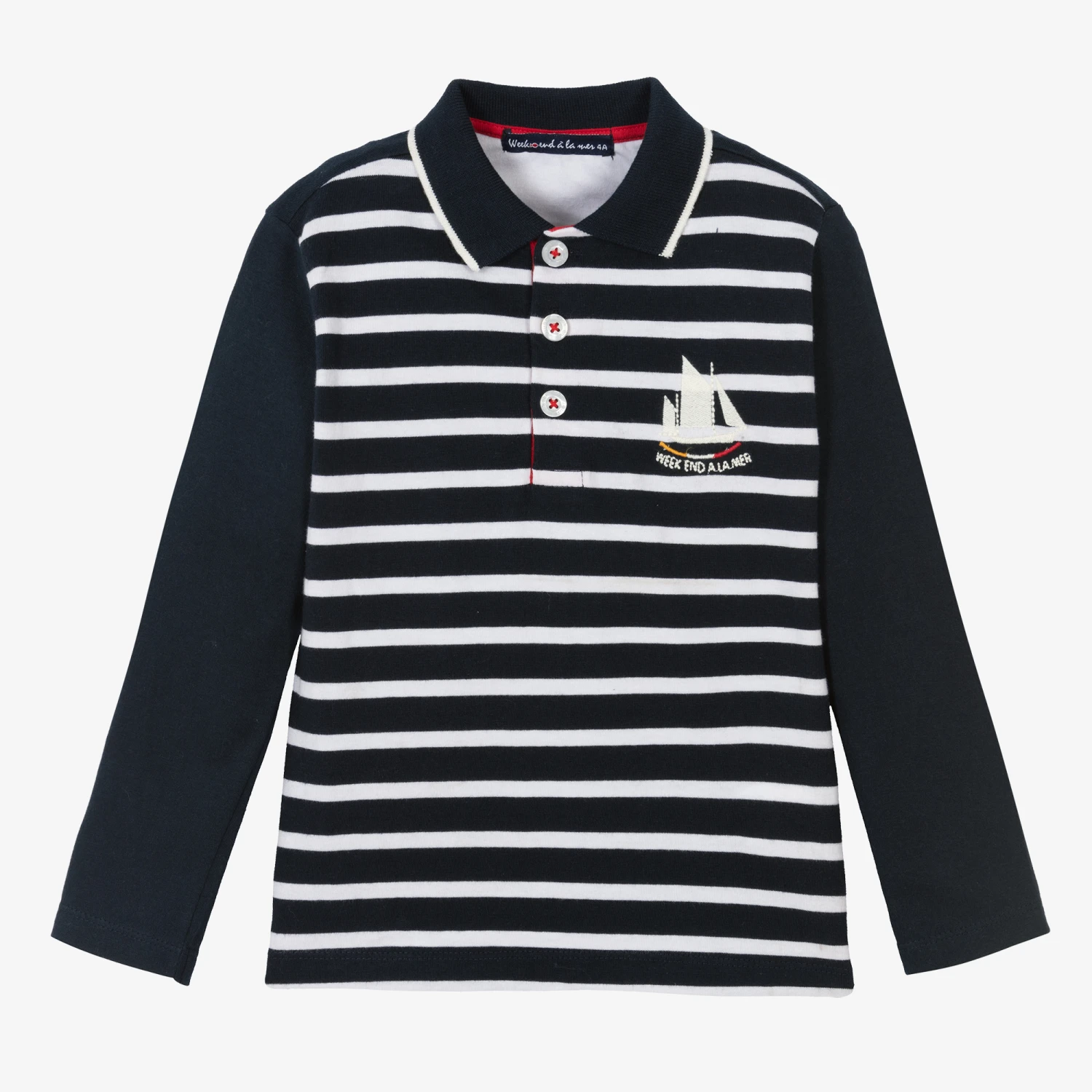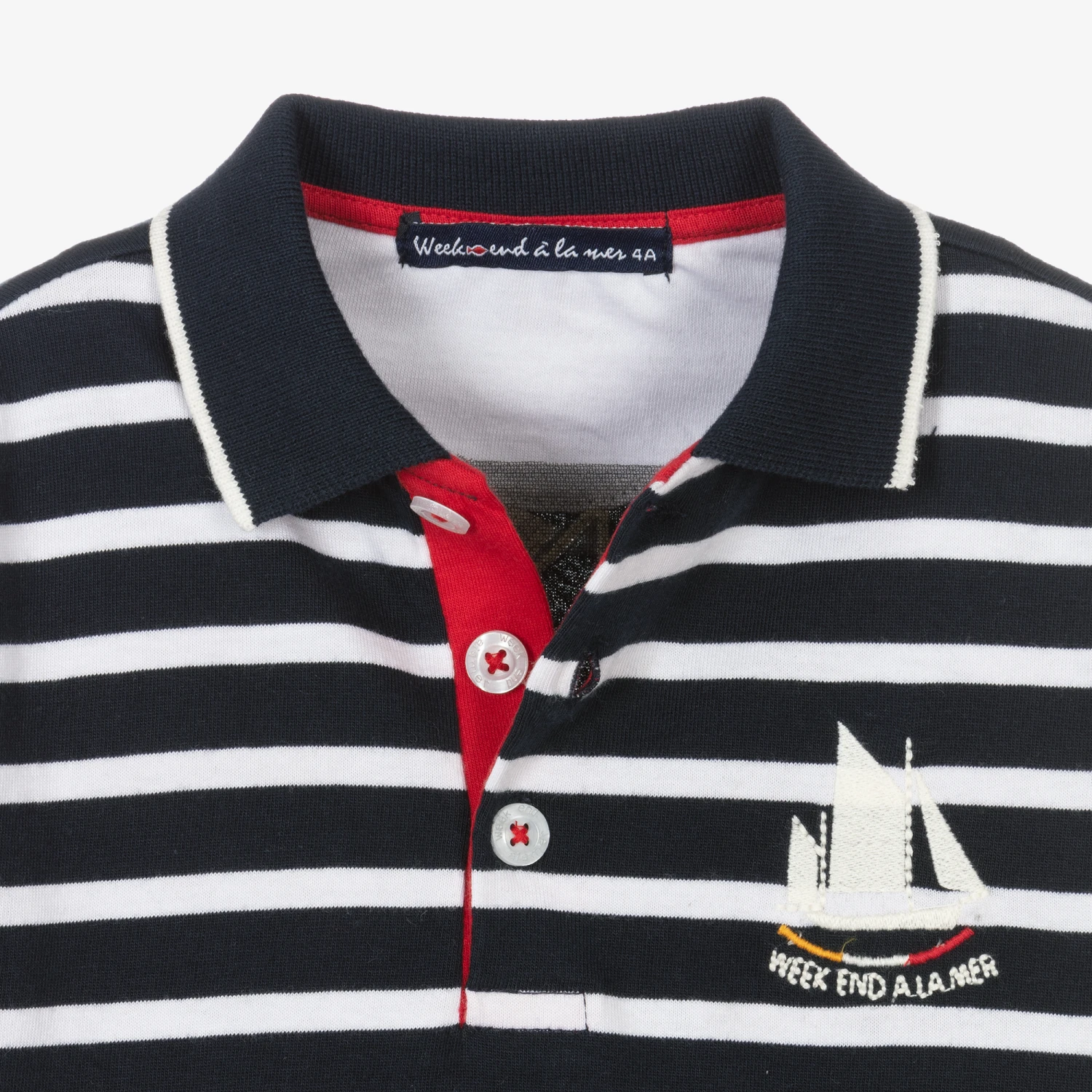 Boys navy blue and white striped polo top by Week-end à la mer, made in soft cotton jersey. It has a navy blue ribbed collar, with a fine white trim, and branded button fastenings on the front for a classic, nautical look. Easy to wear, it has a branded sailing boat logo on the chest. The navy-blue back has contrasting red elbow patches and a larger-sized logo for a branded touch.