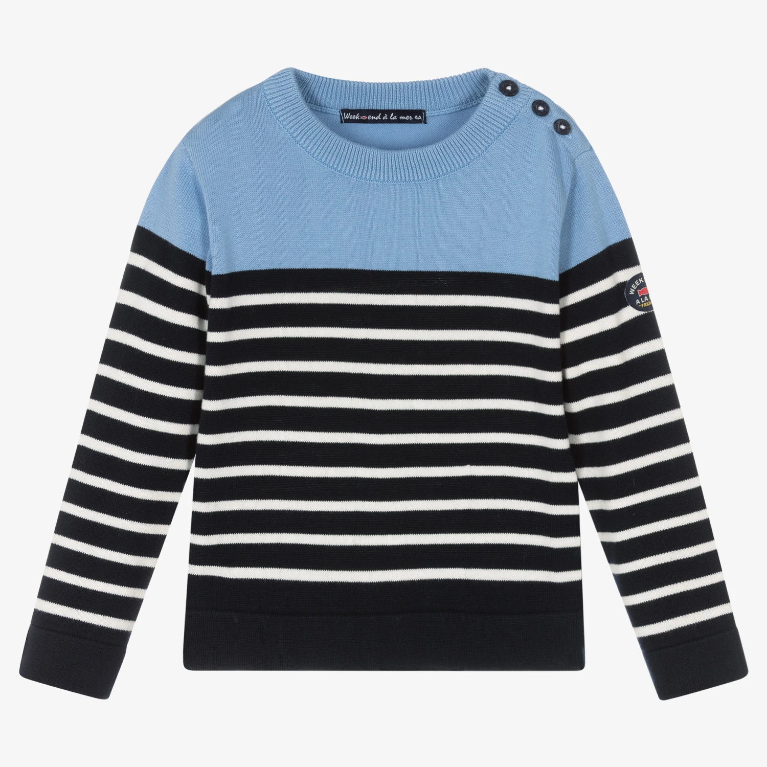 Pale blue, navy blue and ivory sweater for boys by French brand Week-end à la mer, ideal for relaxed days. Made in a comfortable cotton knit, it has the designer’s signature Breton stripes for a nautical look, with a signature tab on one sleeve. There are useful logo button fastenings on one shoulder to make dressing easy.