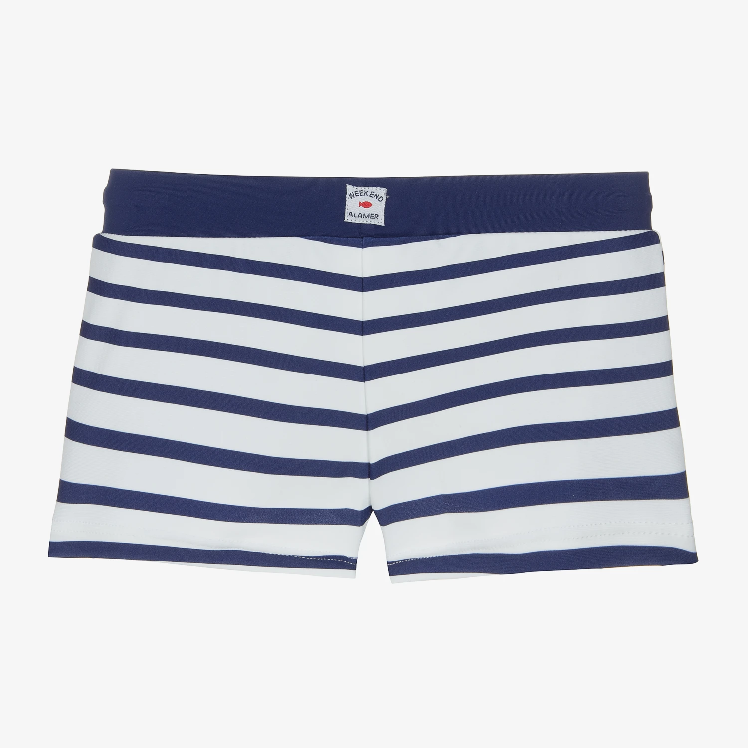 Blue and white swimming trunks for boys by French designer Week-end à la mer, with the brand’s signature Breton stripes. Silky smooth and with a front lining for comfort, they have a drawstring waistband for a good fit, a red logo fish printed on one leg and a logo tab around the back.