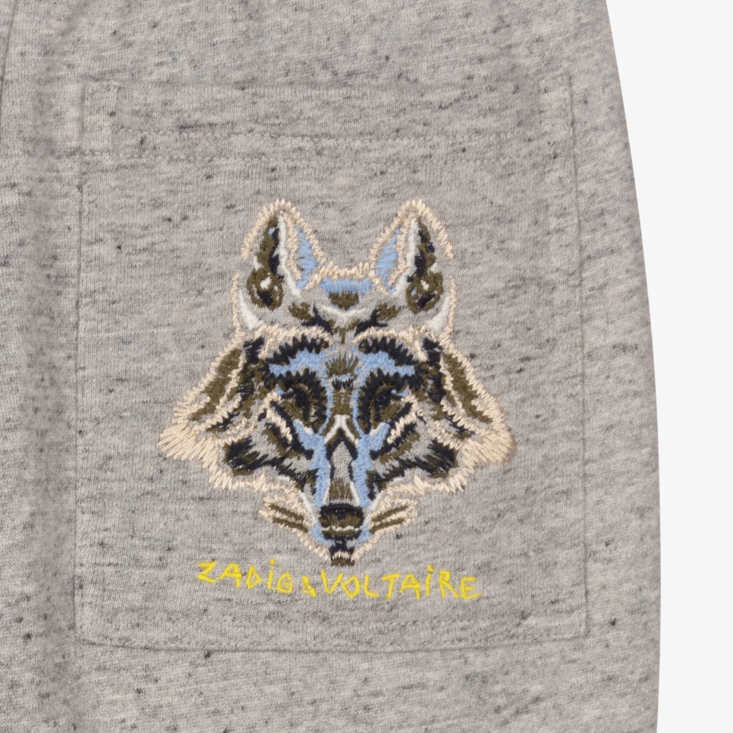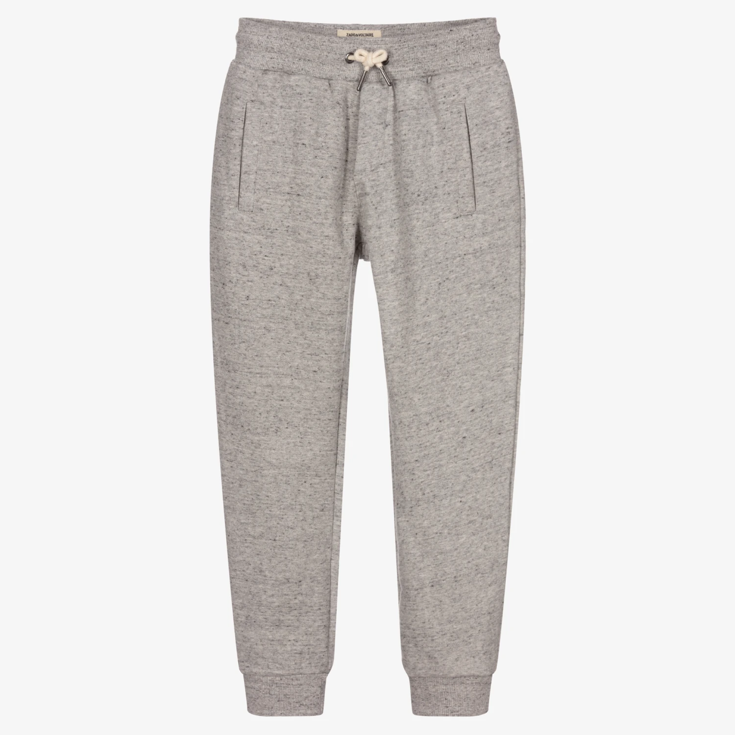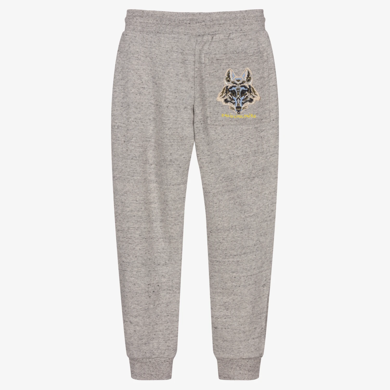 Grey marl cotton joggers for boys by Zadig&Voltaire. They have an elasticated drawstring waistband and side pockets. There is a wolf embroidered on the back pocket, above the brand name.