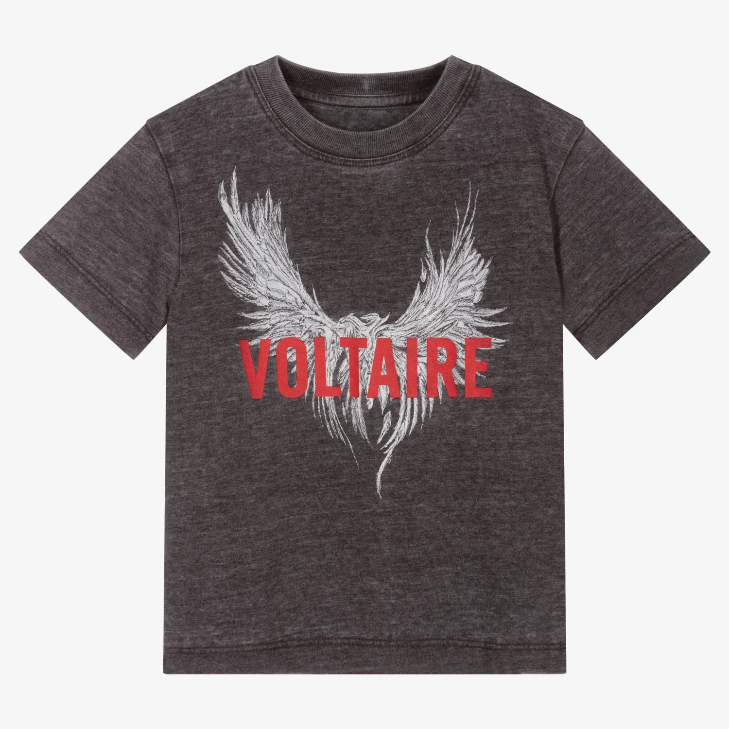Boys dark heather grey T-shirt from Zadig & Voltaire Kids, with a red logo over a white spread eagle printed on the front. It is made in super soft, burnt-out wash effect cotton jersey.
