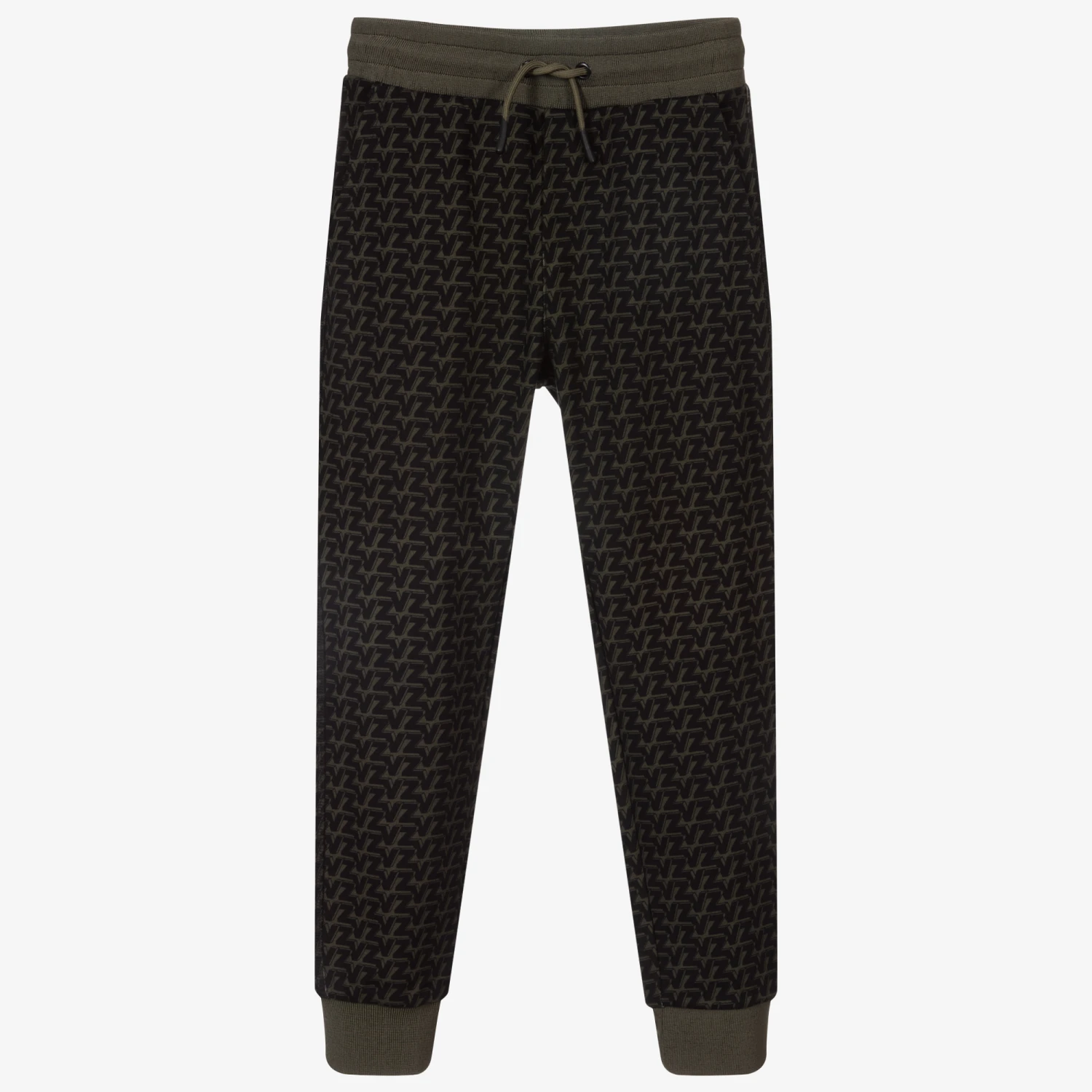 Khaki green joggers for boys by Zadig & Voltaire Kids, made in a soft and stretchy viscose jersey blend, with a black all over logo print. They have slanted front pockets, back patch pockets, ribbed trims and a drawstring waist.